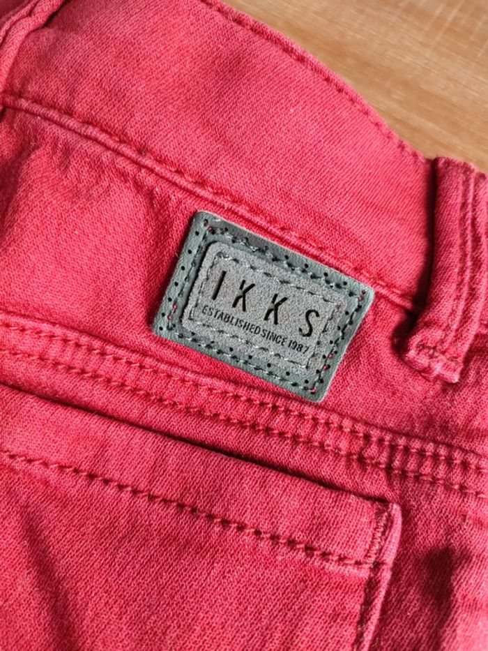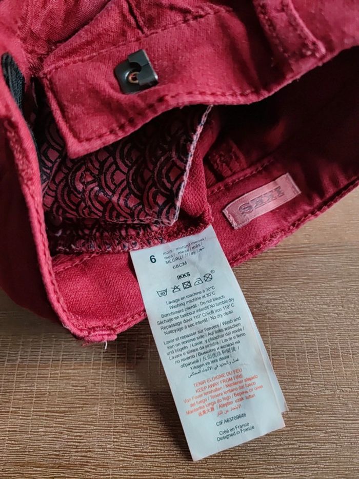 Jean slim, stretch, confortable Couleur rouge bordeaux Détails coutures genoux Fermeture crochet Taille ajustable Marque IKKS Taille 6 mois Peu porté, état neuf Peut être porté mixte #cyboulette44garcon6mois