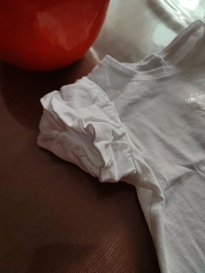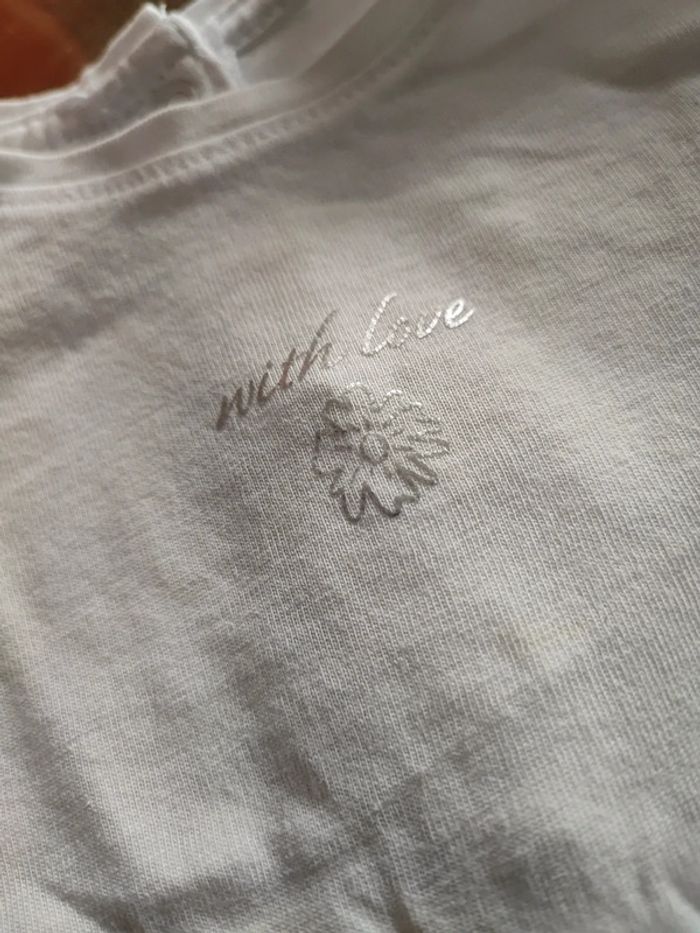 Tee-shirt blanc Manches courtes, joli effet boule Inscription With Love devant Fermeture par pressions dans tout le dos Porté une seule fois, état neuf Marque Gémo Taille 6 mois