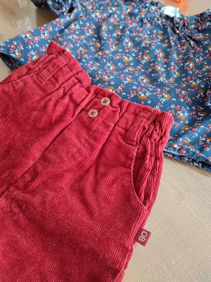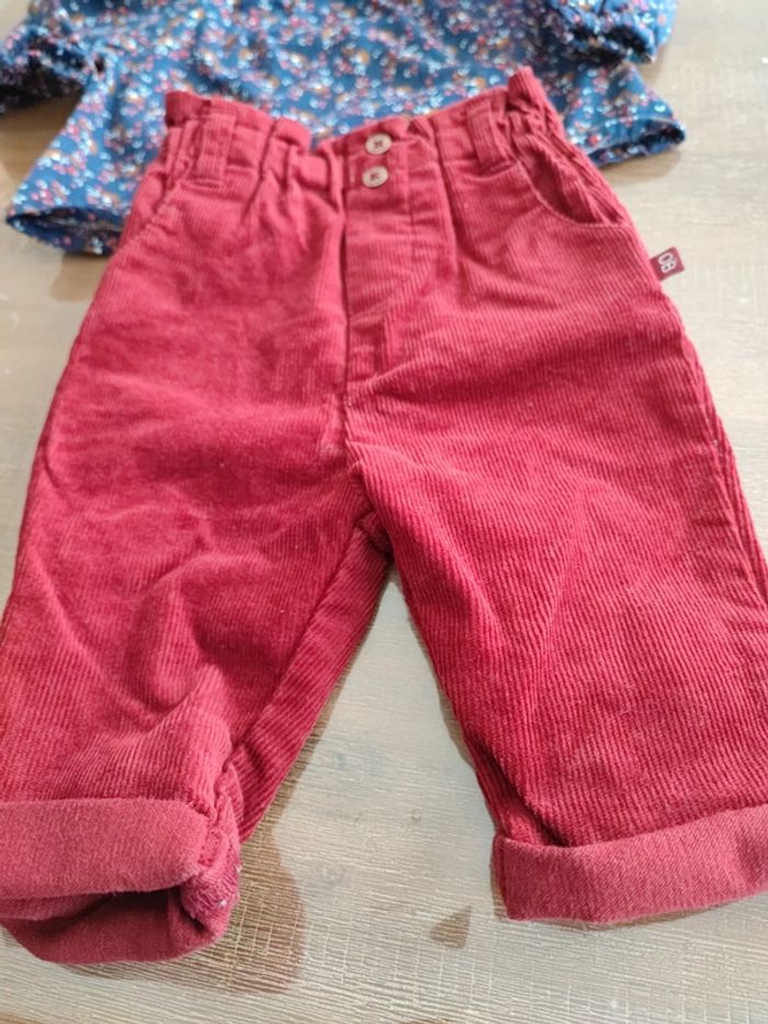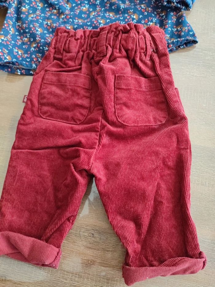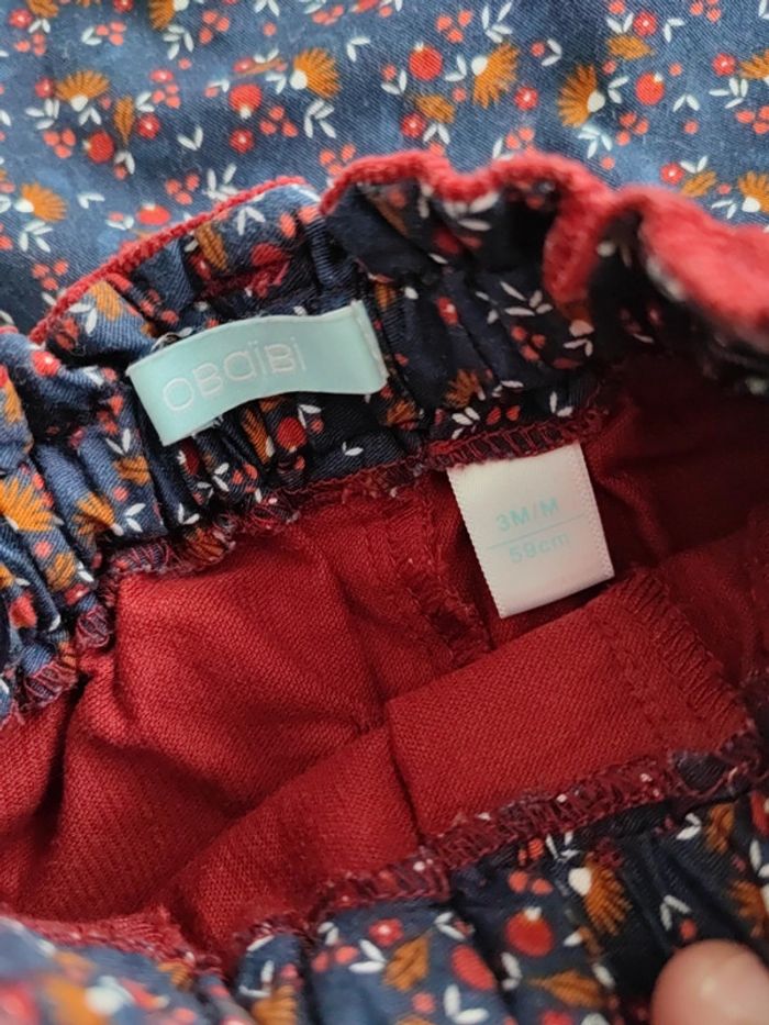 Joli pantalon rouge velours côtelé Taille élastique et froncée Porté 2 fois, très bon état Marque Obaibi, taille 3 mois 59 cms Est assorti au petit haut vendu dans le dressing #cyboulette44fille3mois
