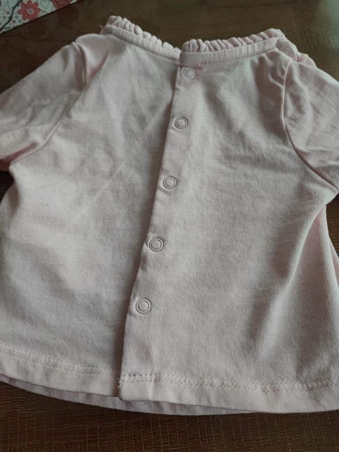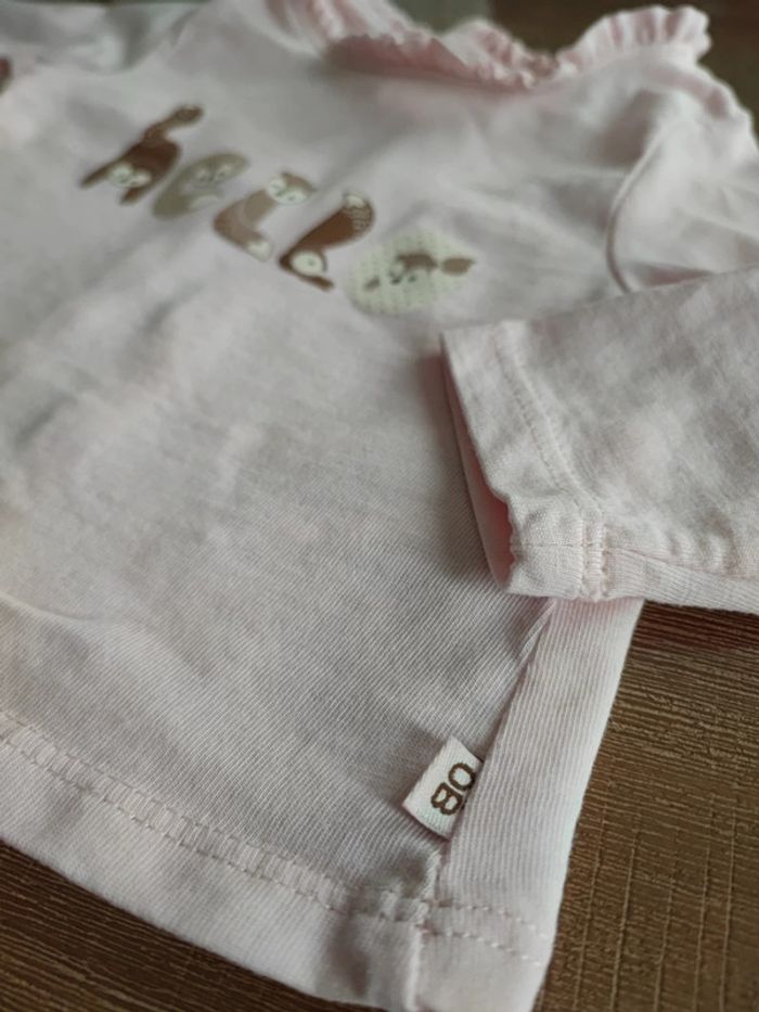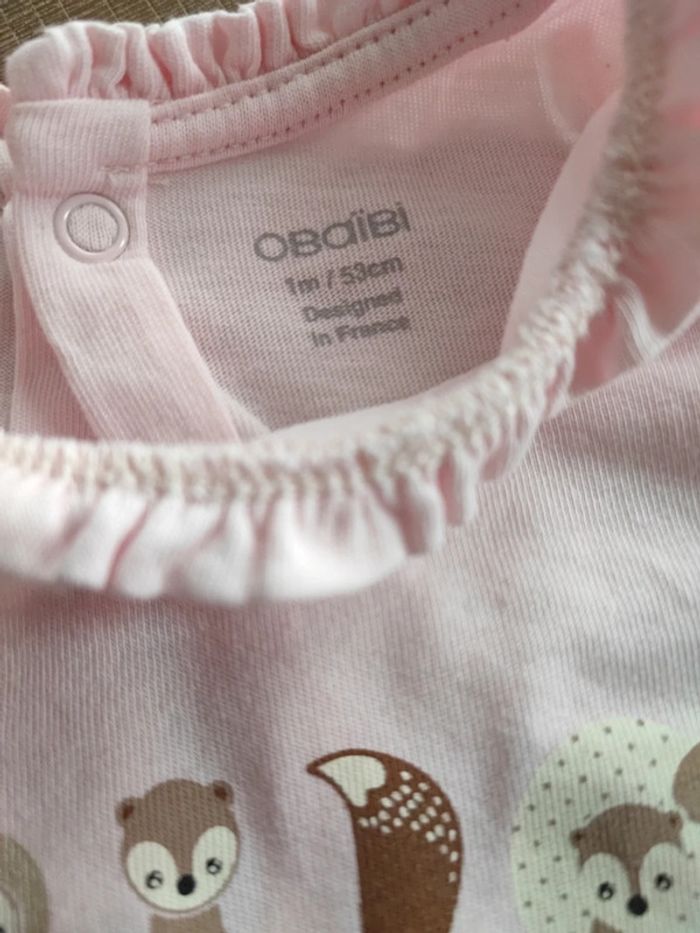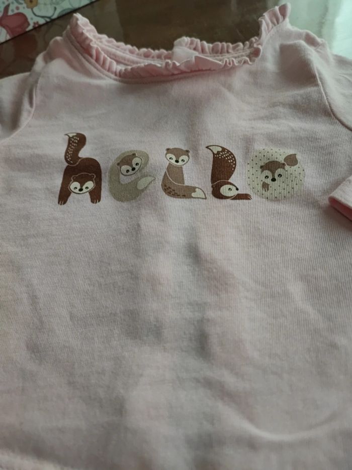 Petit tee-shirt manches longues Rose clair avec petit écureuil (lettres hello) Col froncé Marque obaibi, taille 1 mois 53cms Très peu porté, état neuf #cyboulette44fille1mois
