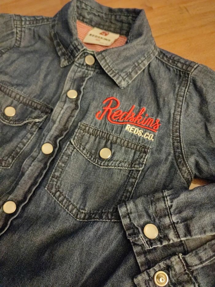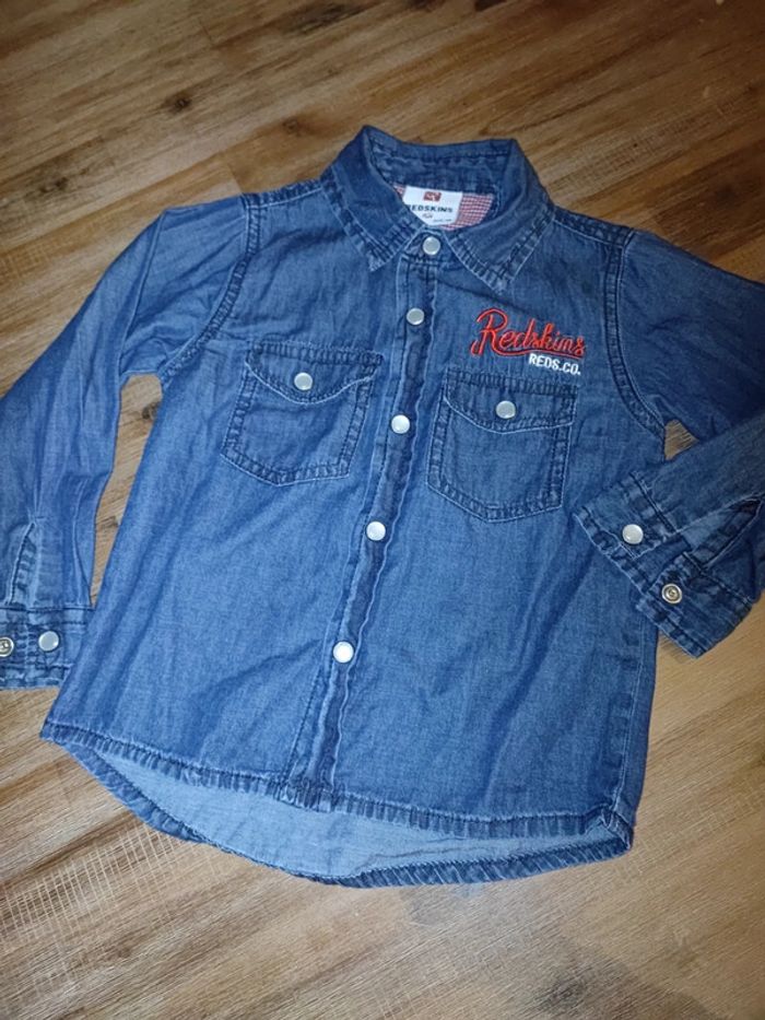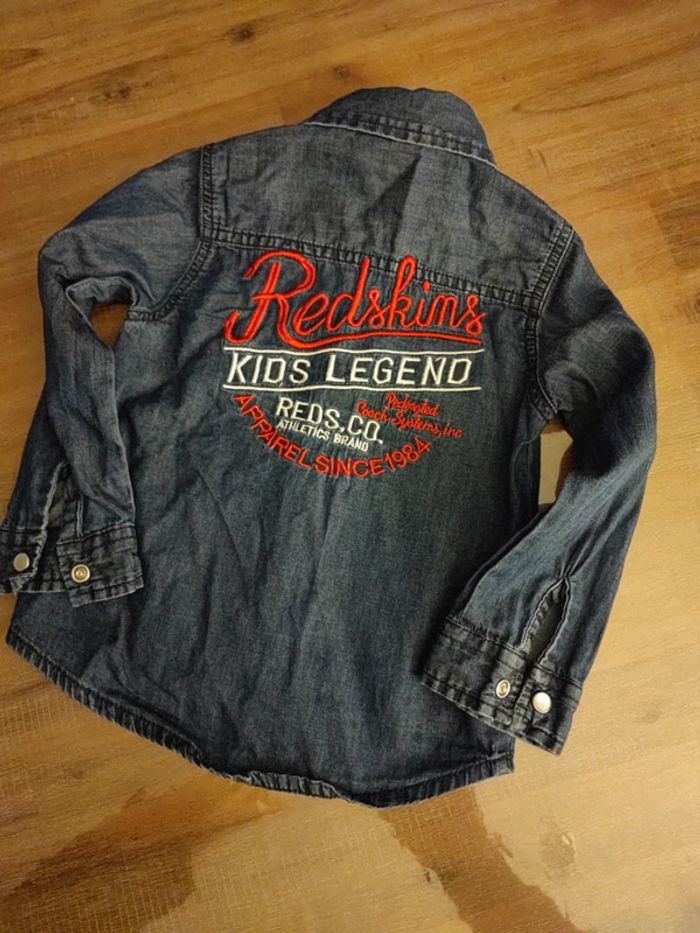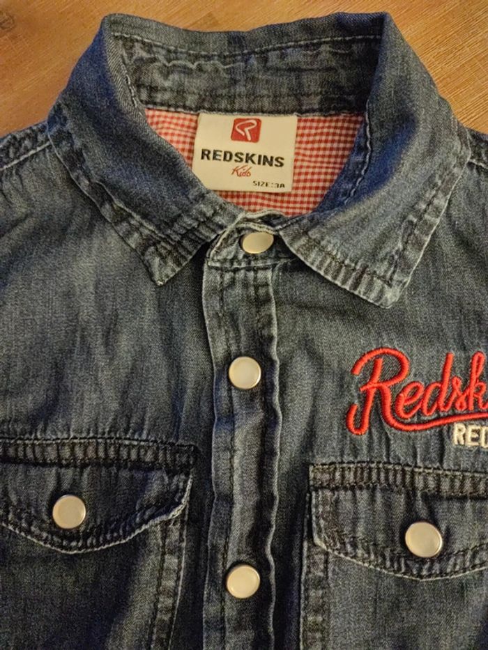 Chemise manches longues Couleur bleu jean, inscriptions en rouge devant et dans le dos Fermeture par boutons pression Marque Redskins, taille 3ans Très bon etat, peu portée #cyboulette44garcon36mois