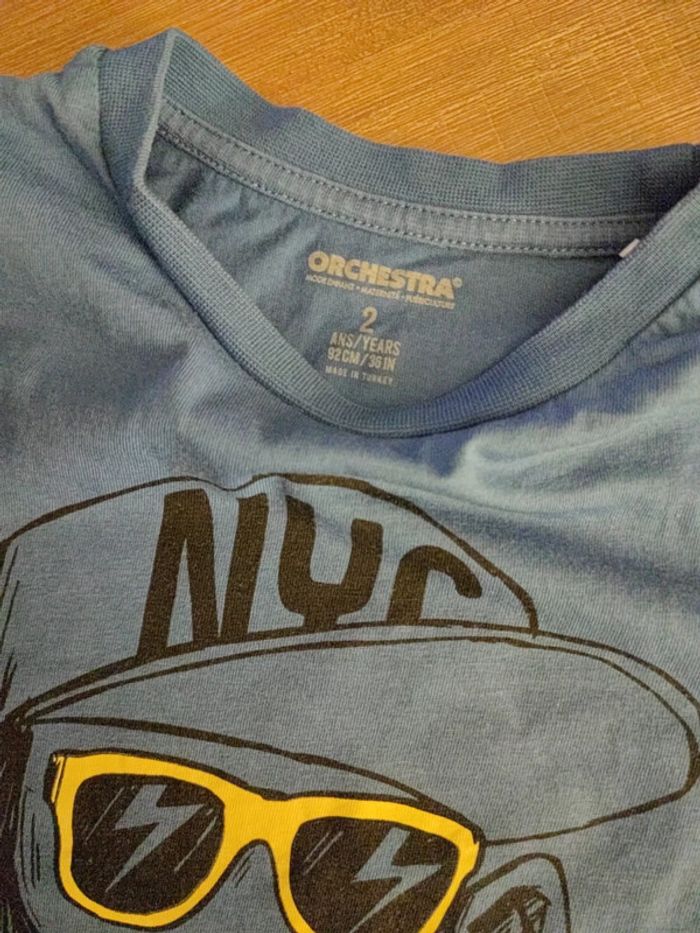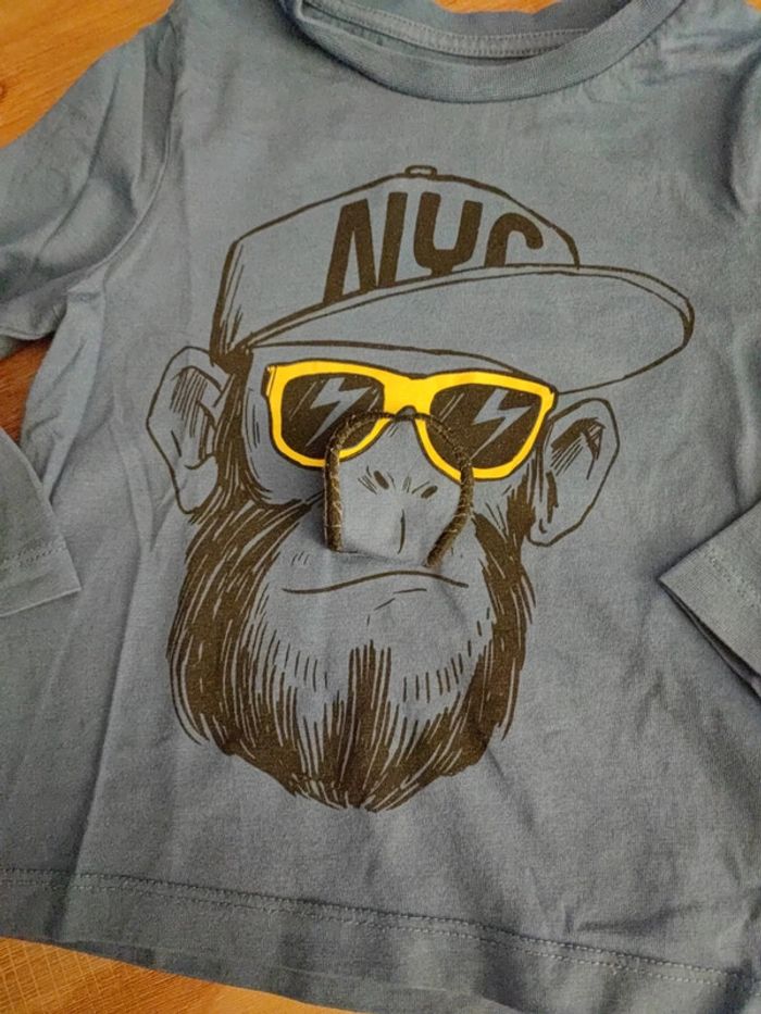 Tee-shirt manches longues Bleu avec motif singe a casquette, lunettes jaunes et langue rouge en relief Marque Orchestra, taille 2 ans 92cms Très bon état #cyboulette44garcon24mois