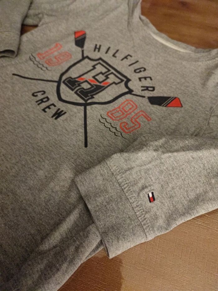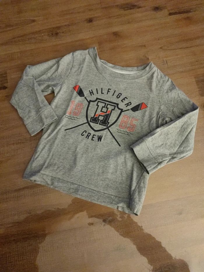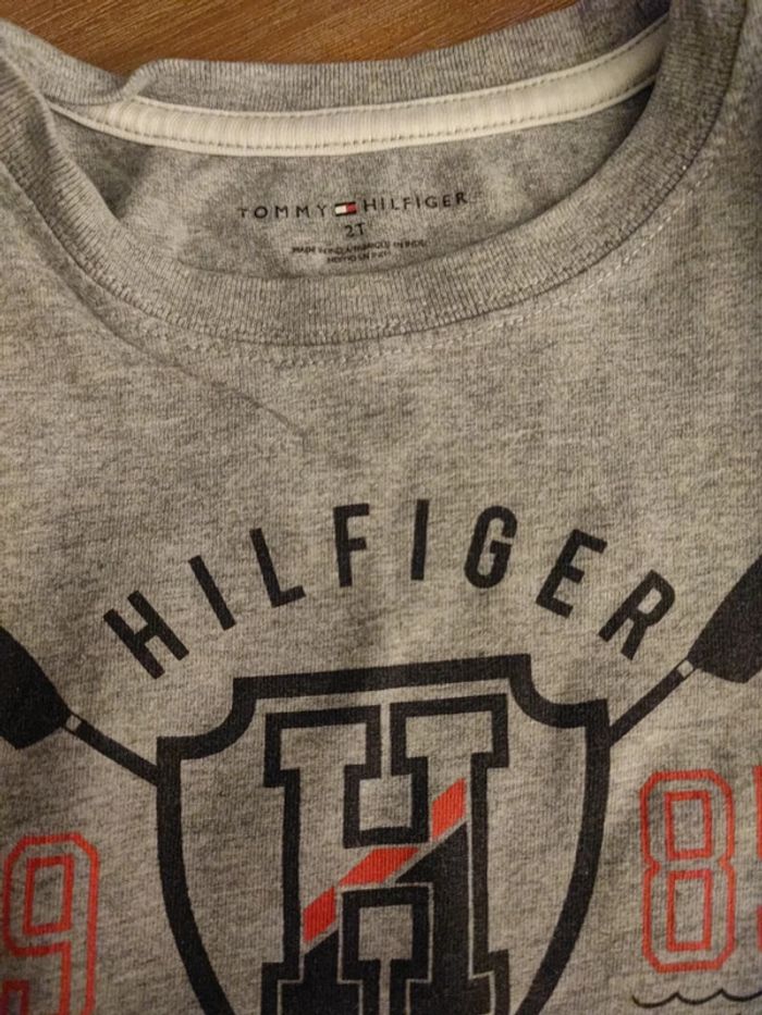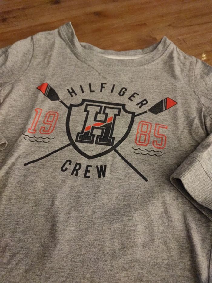 Tee-shirt manches longues Gris avec motif marque Tommy Hilfiger 1985 bleu marine et rouge devant Taille 2 ans (convient pour enfant 85-95cms) Très bon état #cyboulette44garcon24mois