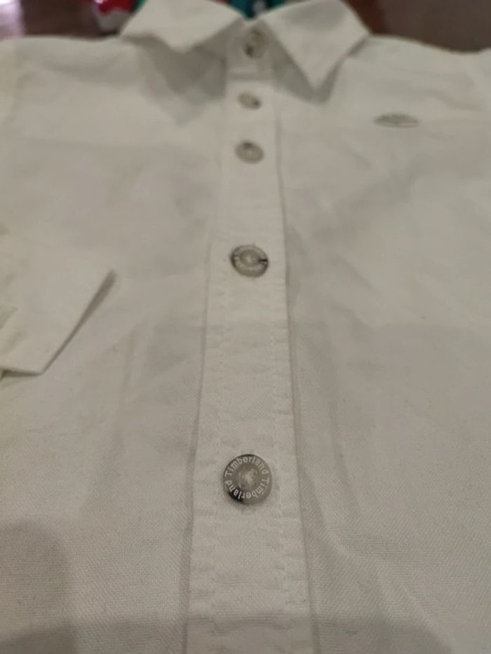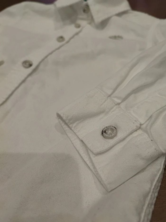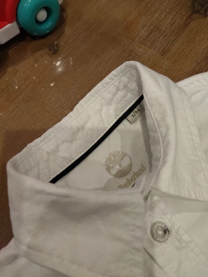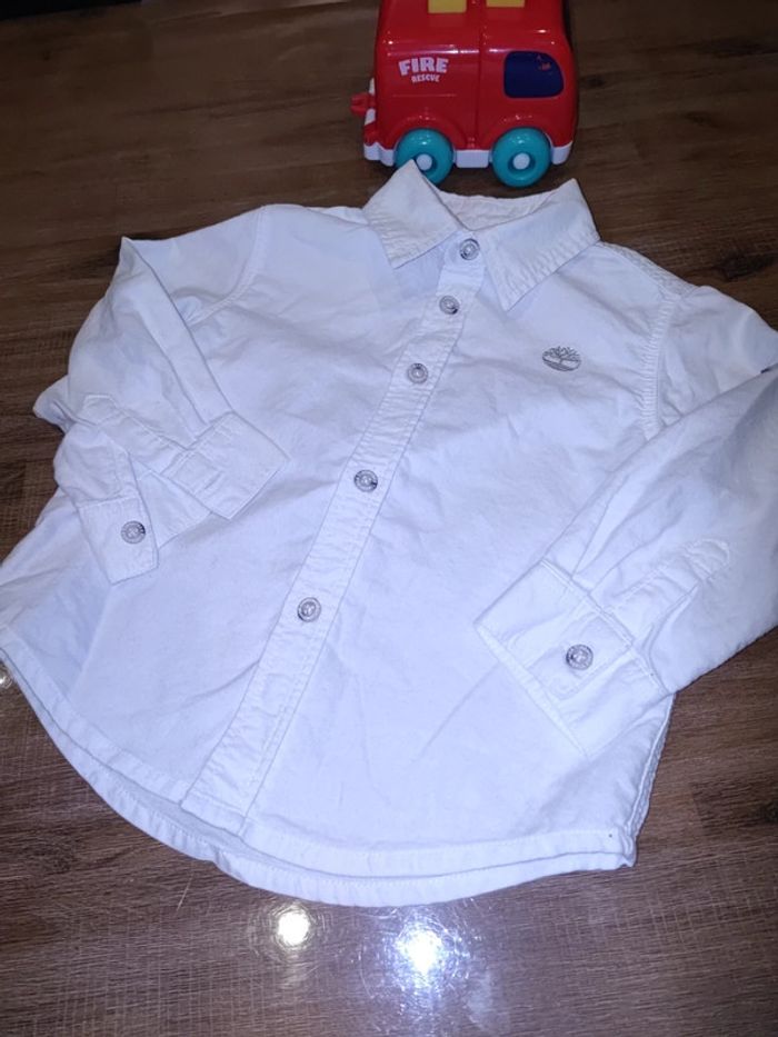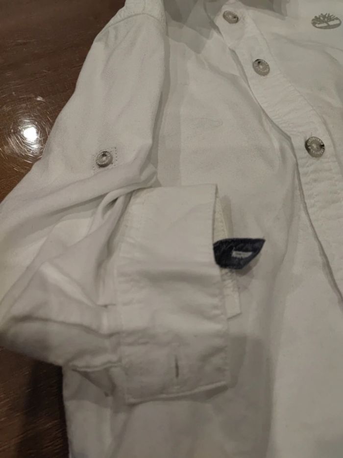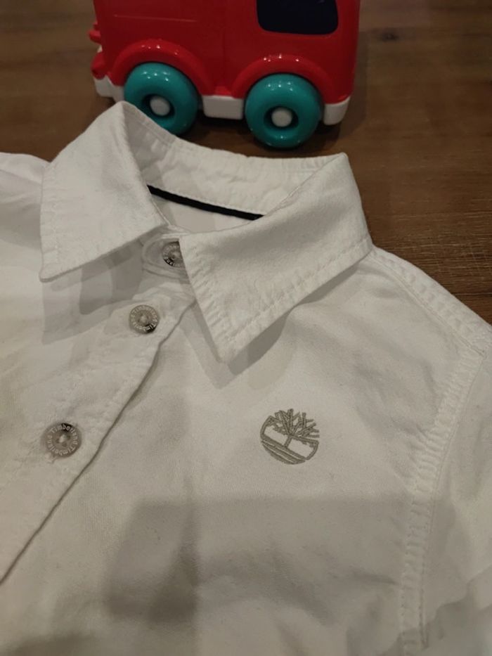 Chemise manches longues, pouvant être retroussées grâce à une languette, blanche, peu portée, marque Timberland, taille 2 ans 86cms #cyboulette44garcon24mois