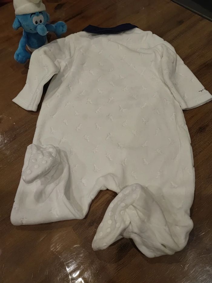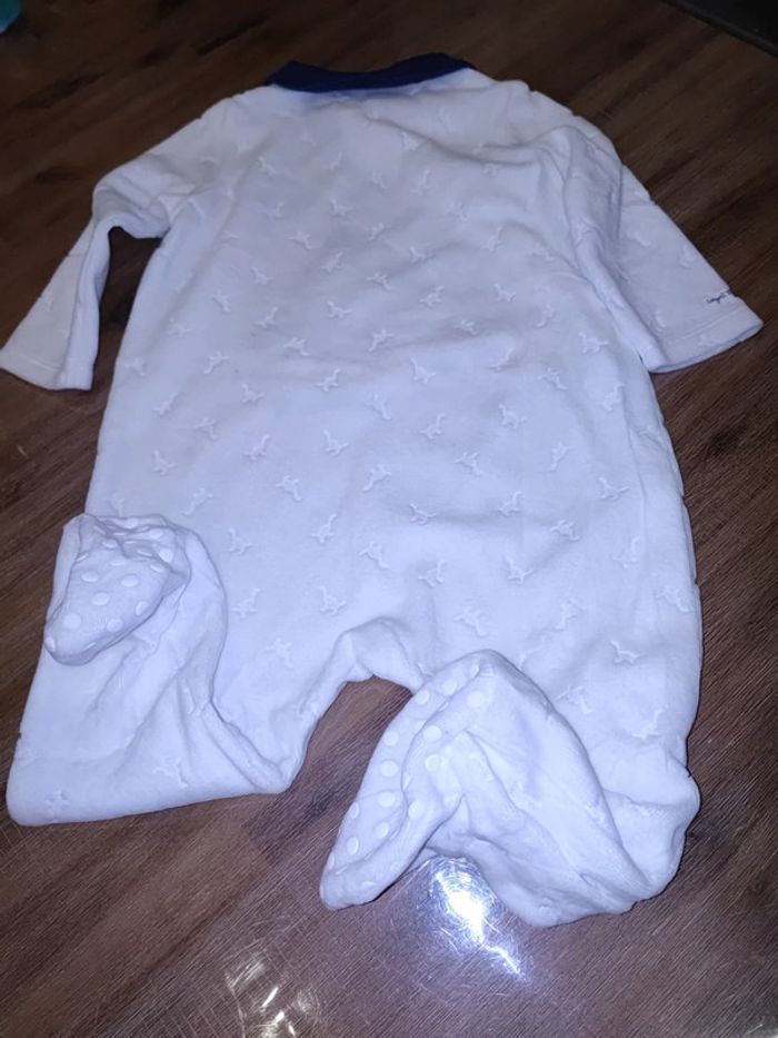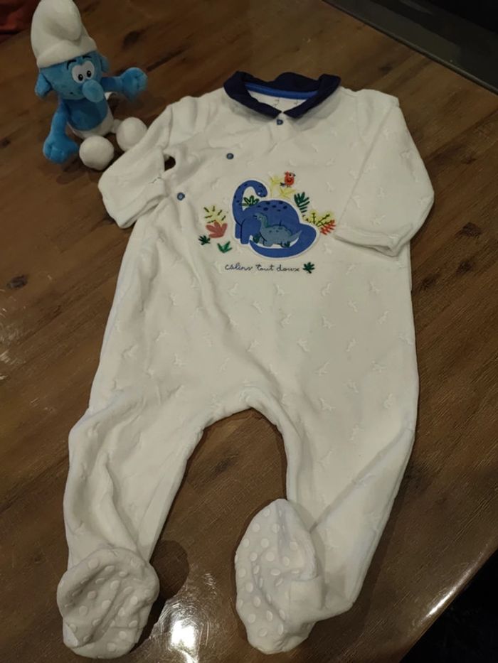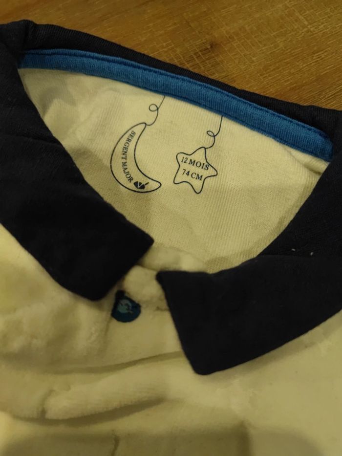 Pyjama 1 pièce, couleur crème, petit col marine, ouverture pressions devant, motif dinosaure et inscription Câlins tout doux devant, semelles picots anti dérapant, porté 2 fois, état excellent, marque sergent major, taille 12 mois 74 cms #cyboulette44garcon12mois