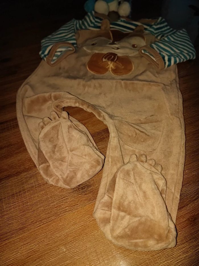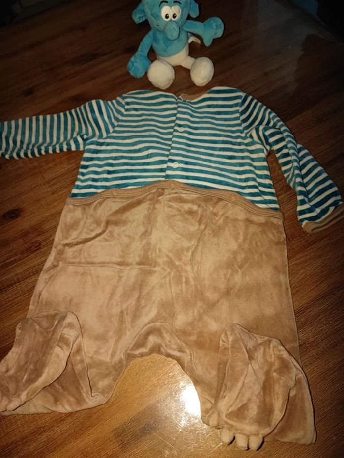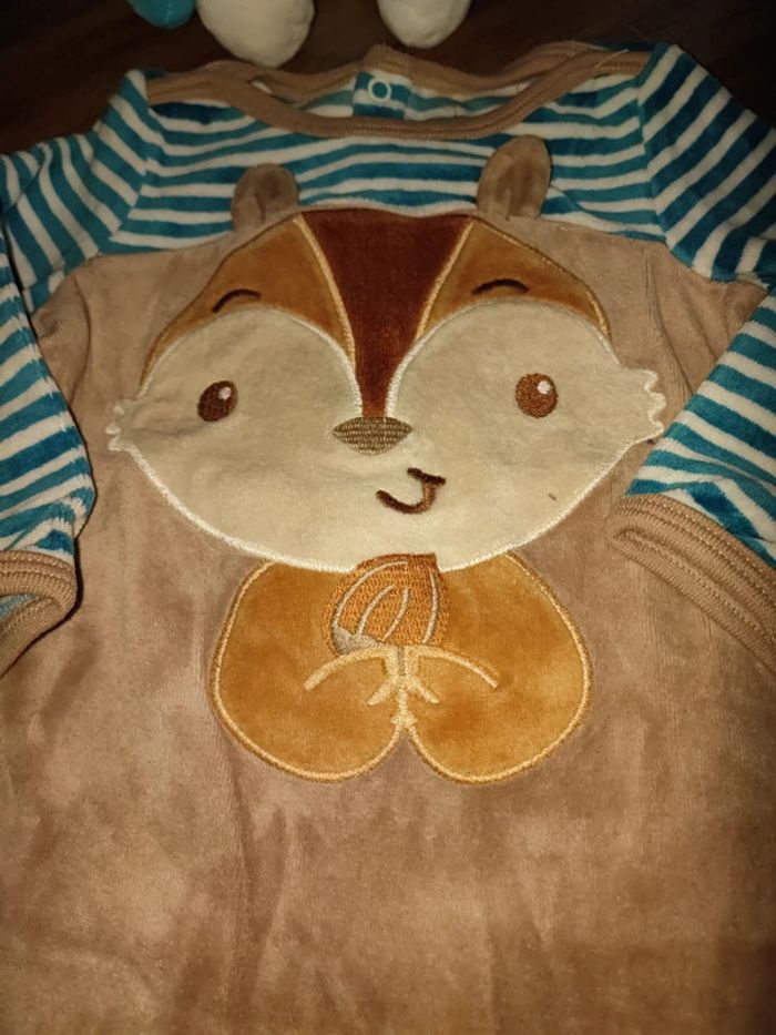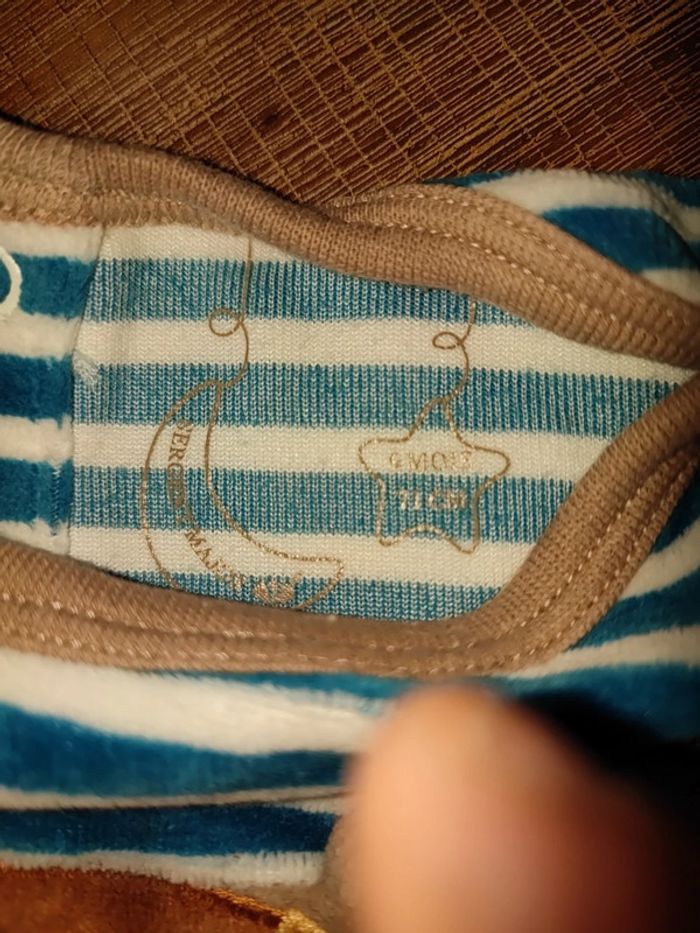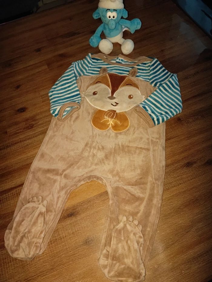 Joli pyjama 1 pièce, couleur noisette et bleu rayé blanc, motif écureuil, trop mignon, originalité aux pieds, ouverture pressions dos, peu porté, état excellent, marque sergent major, belle qualité, taille 9 mois 71 cms #cyboulette44garcon9mois