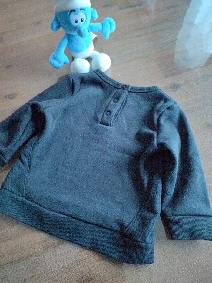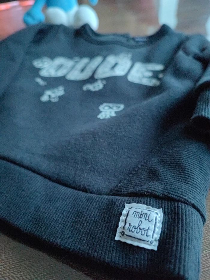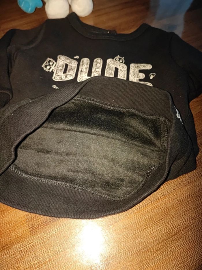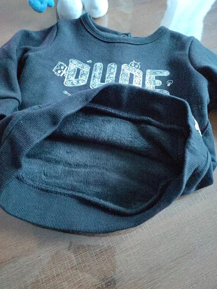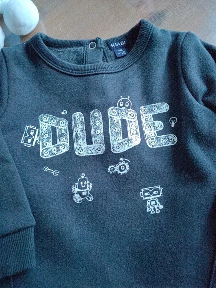 Pull sweat noir avec inscription Dude devant, intérieur polaire doux, ouverture pressions nuque, peu porté, très bon état, marque Kiabi, taille 9 mois 69/72cms #cyboulette44garcon9mois