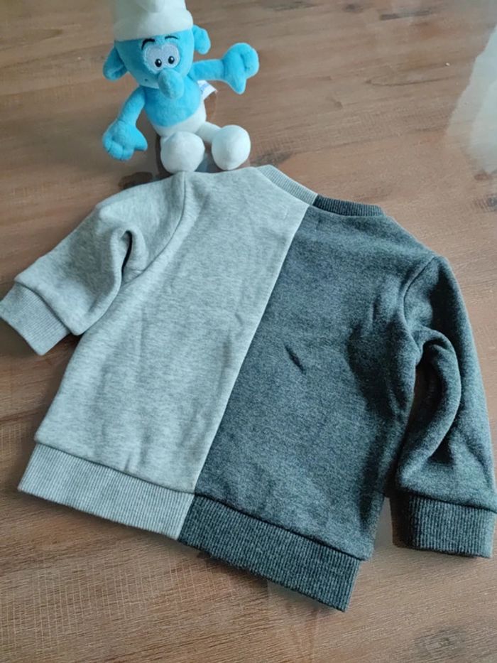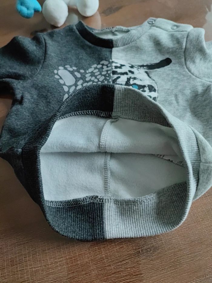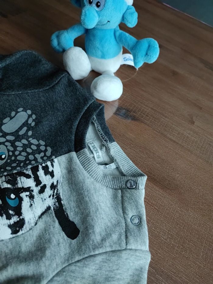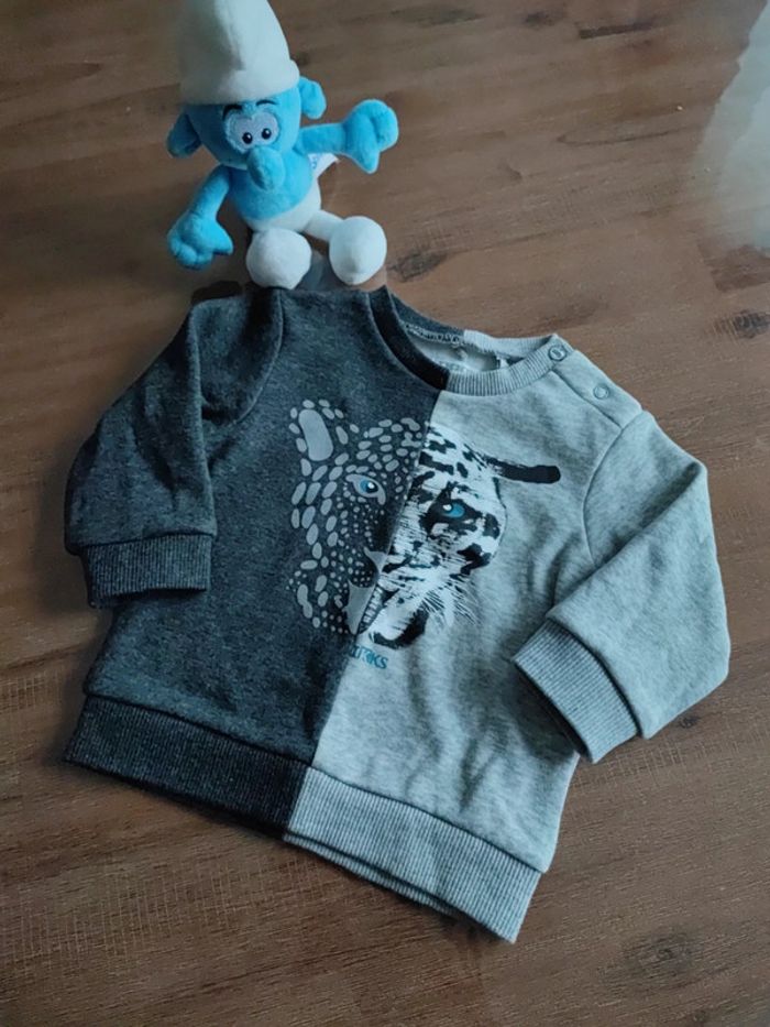 Joli pull sweat gris foncé et gris clair, motif tigre aux yeux bleu canard devant, pressions épaule, matière intérieure douce, porté 2 fois, état neuf, marque IKKS, taille 6 mois 68 cms #cyboulette44garcon6mois