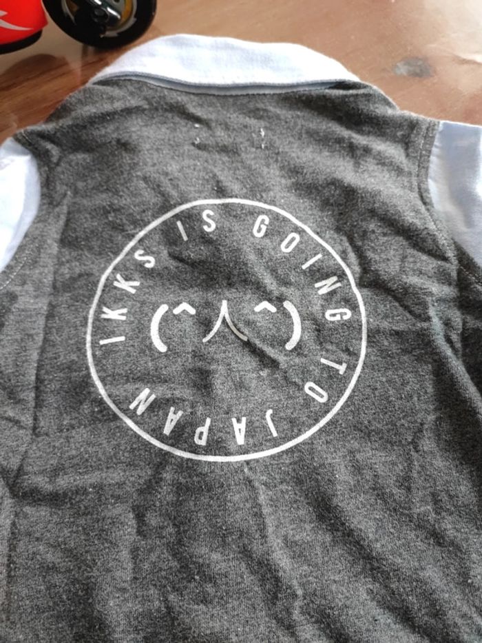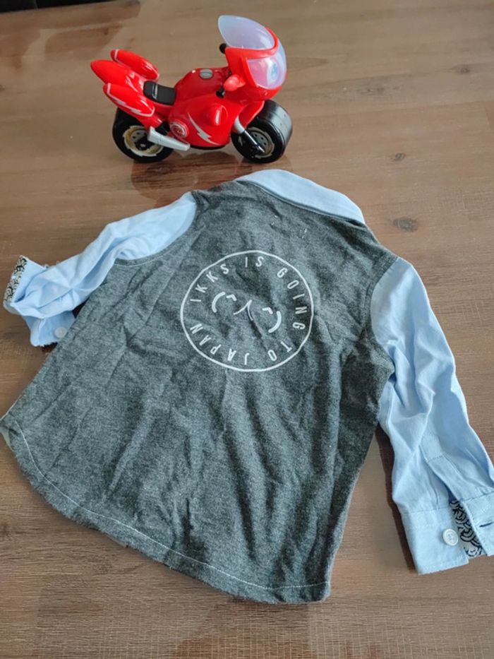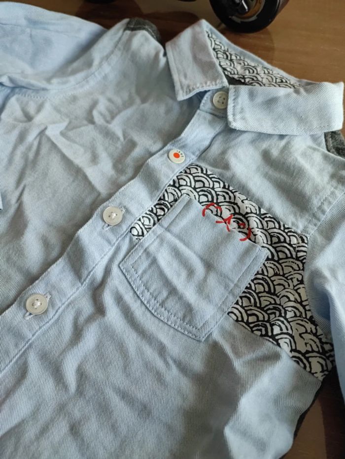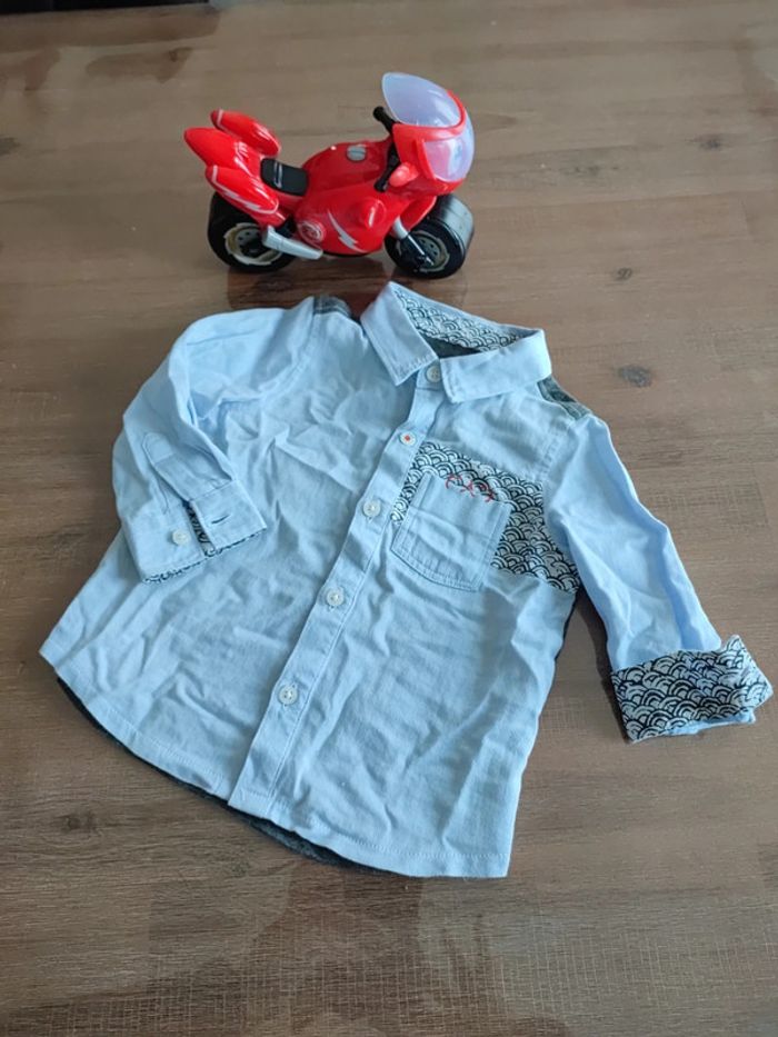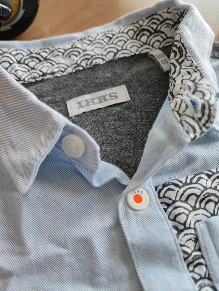 Chemise manches longues, bleue ciel avec petits motifs sur poche poitrine et intérieur col et poignets, dos gris avec inscription, marque IKKS, taille 6 mois 68 cms, peu portée, très bon état #cyboulette44garcon6mois