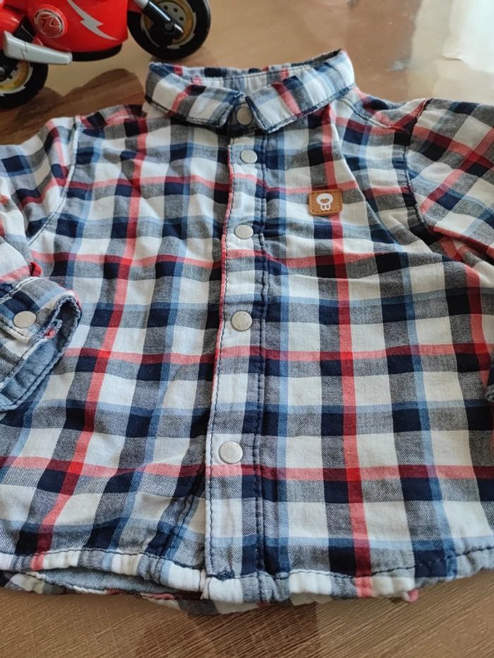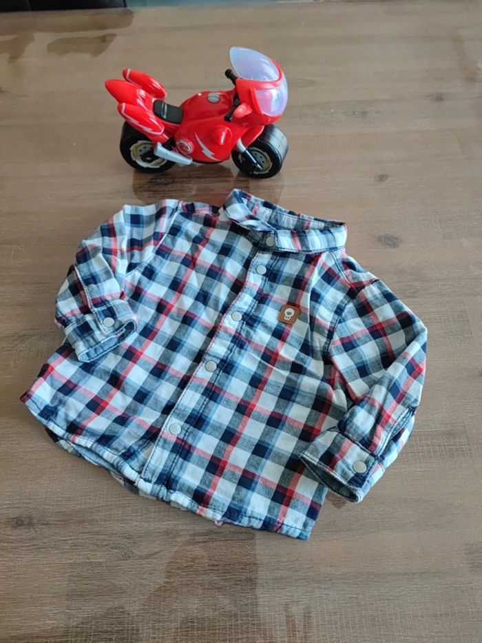 Chemise manches longues, bleu marine blanche et rouge a carreaux, ouverture par pressions, fine doublure, portée une seule fois, état neuf, marque Obaibi, taille 6 mois 68 cms #cyboulette44garcon6mois