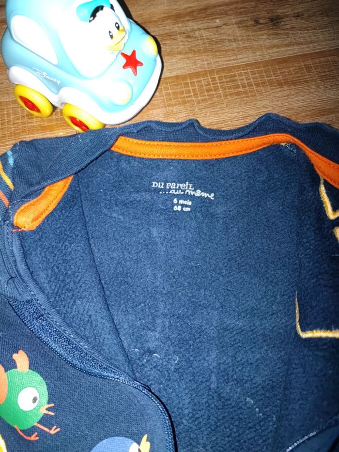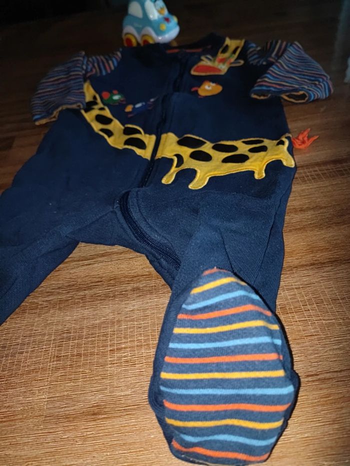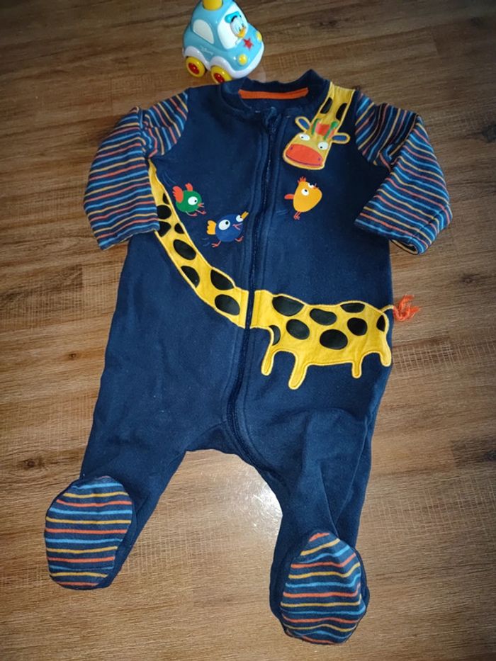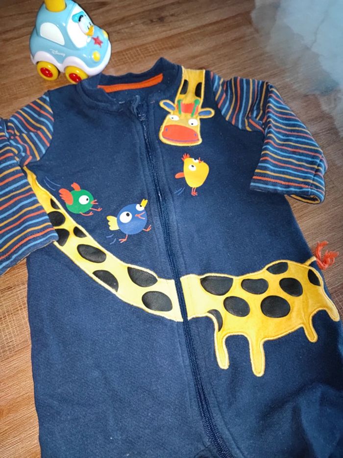 Pyjama 1 pièce, bleu marine avec motifs girafe et oiseaux, fermeture éclair devant, bras et dessous de pieds rayés colorés, bon état, marque DPAM, taille 6mois 68cms #cyboulette44garcon6mois
