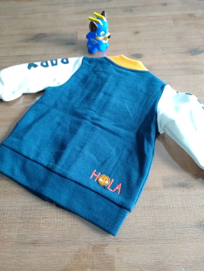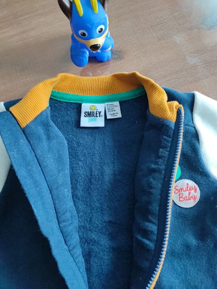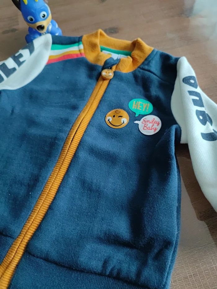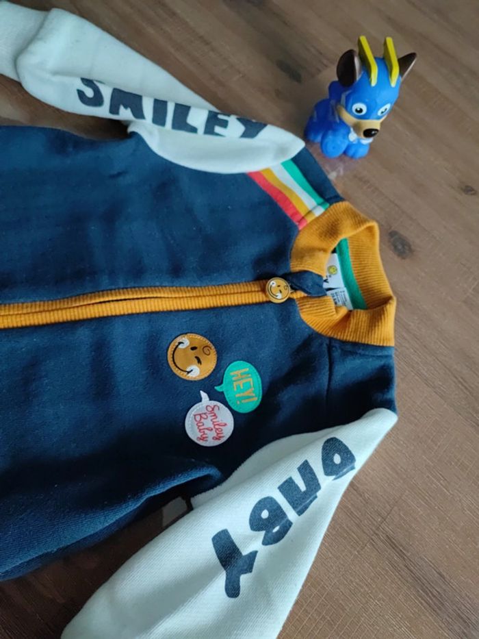 Gilet zippé bleu marine, manches blanches avec inscriptions Smiley et Baby, liseret et col jaune moutarde, marque orchestra, collection Smiley Baby, taille 3 mois 60 cms, bon état, peu porté #cyboulette44garcon3mois