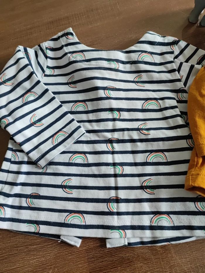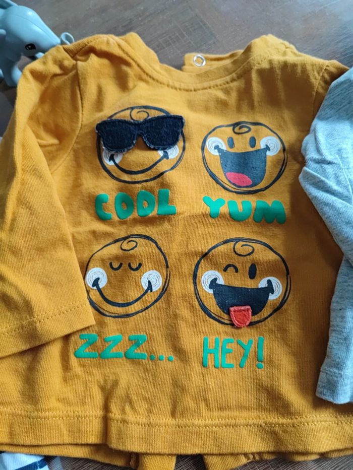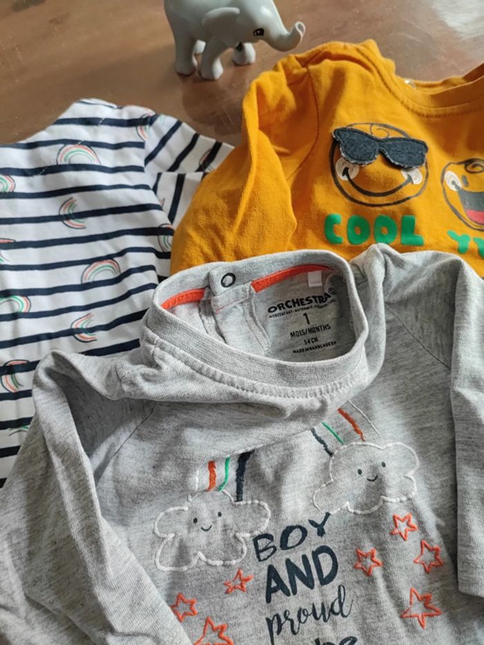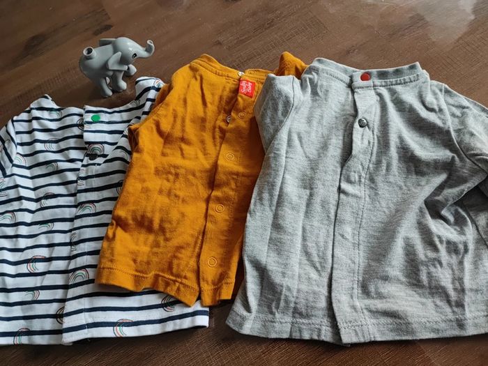 Lot de 3 tee-shirts manches longues Un blanc rayé en marine avec petits motifs Un jaune moutarde avec motifs devant Un gris clair avec inscription devant Peu portés, très bon état Pratique : s'ouvrent tous les 3 par pressions derrière Marque Orchestra, taille 1mois 54cms #cyboulette44garcon1mois