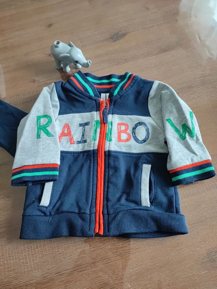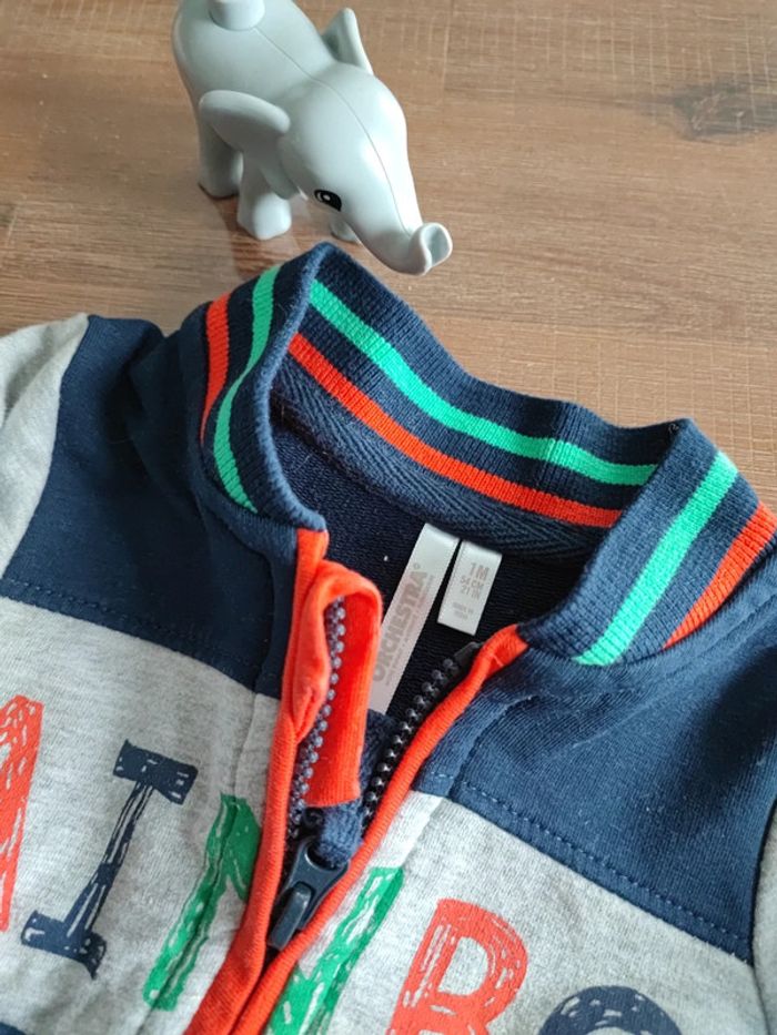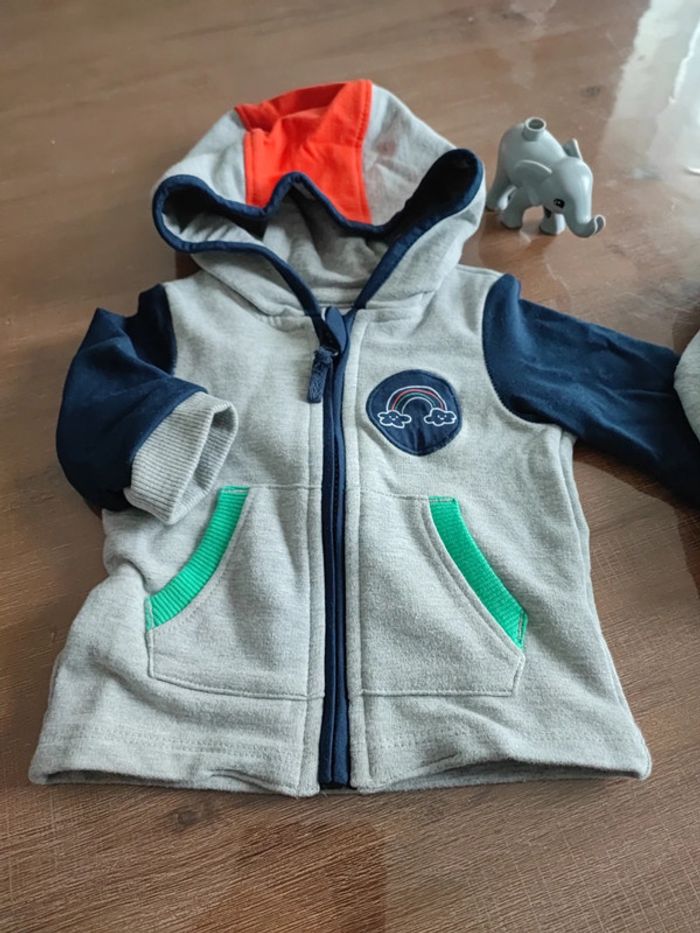 Gilets sweats zippés, un a capuche, couleurs gris, marine et liserets oranges, très bon état, peu portés, taille 1 mois 54cms, marque orchestra #cyboulette44garcon1mois