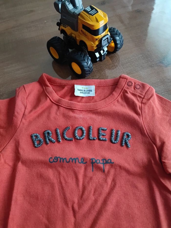 Tee shirt manches longues orange brique, marque TAO, taille 3mois 59cms, inscription relief devant "bricoleur comme papa", état neuf, porté 2 fois #cyboulette44garcon3mois