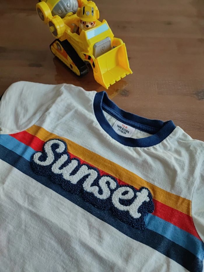 Tee shirt couleur crème avec inscription Sunset matière laine devant sur lignes couleurs, bras et encolure bleu marine, marque Tape a l'oeil, taille 2ans 86cms, très bon état #cyboulette44garcon24mois