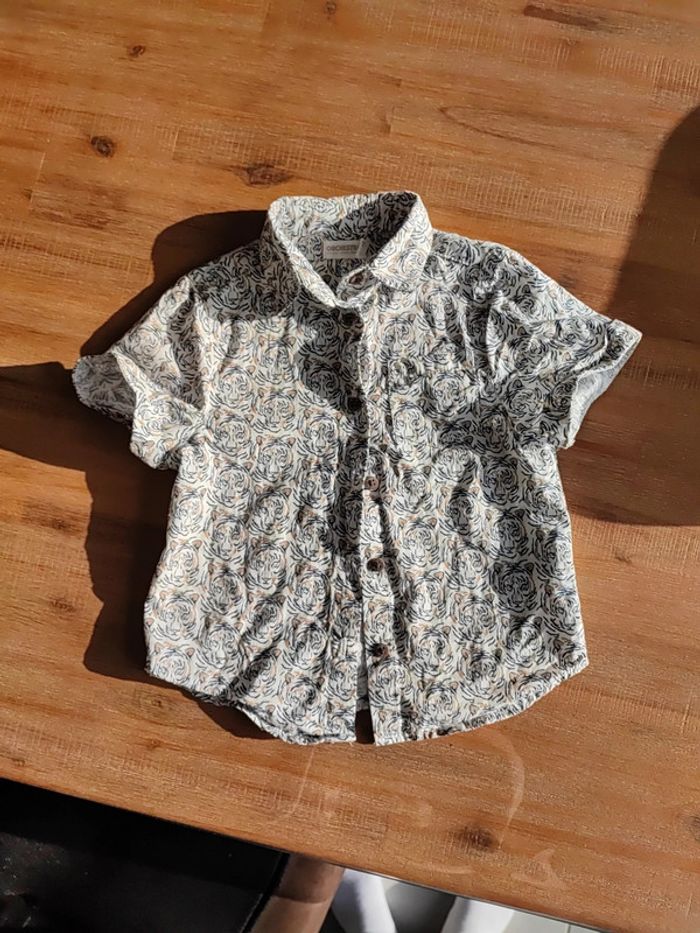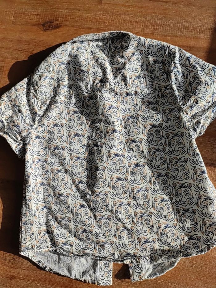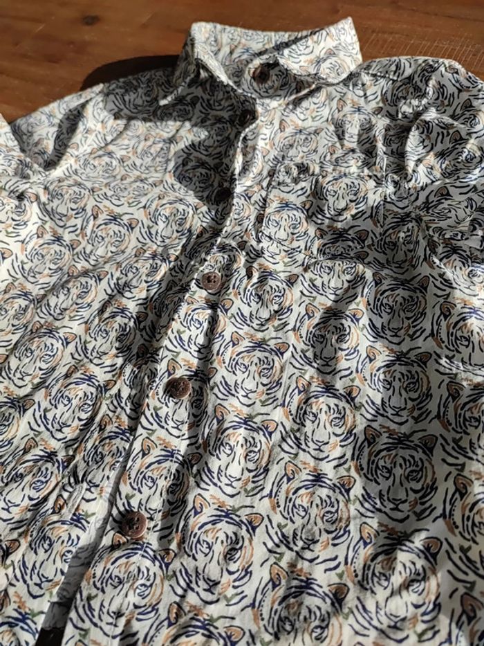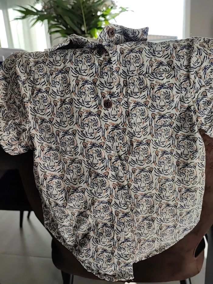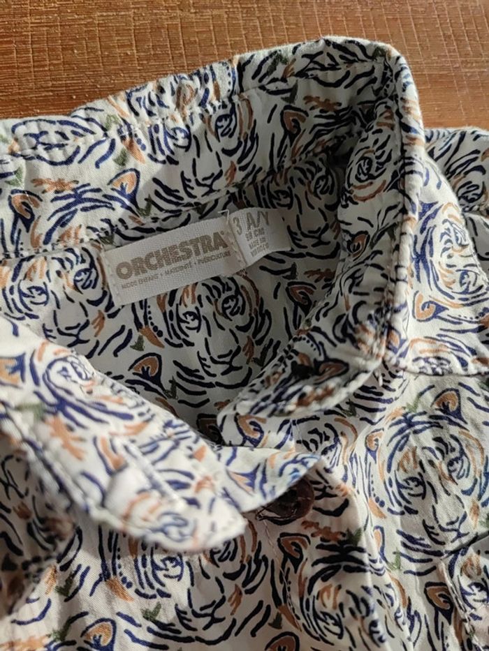 Chemise manches courtes blanche, avec motifs têtes de tigre marine et beige, très joli rendu, taille 3ans 98cms, marque Orchestra Portée 2 fois, état neuf #cyboulette44garcon36mois