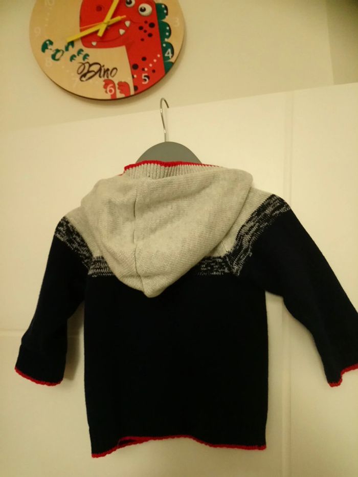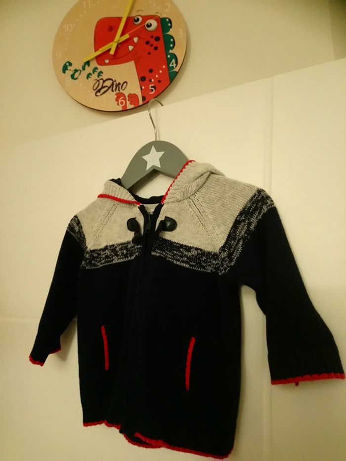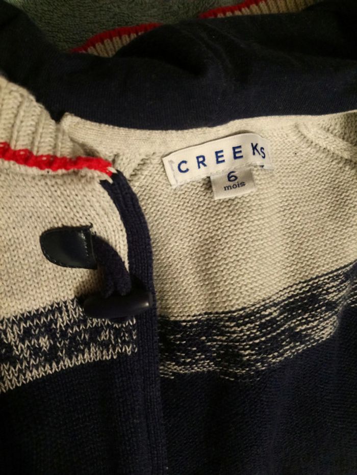 Gilet de marque Creeks, à capuche, bleu, gris et un peu de rouge. Fermeture éclair et un bouton. Porté 1 fois. Taille 6mois #cyboulette44garcon6mois