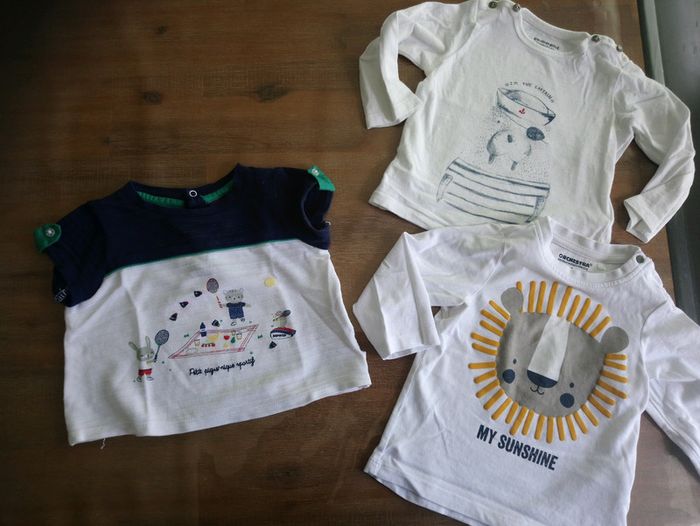 2 tee shirts manches longues blancs vertbaudet et orchestra, 9 mois 1 tee shirt marine et blanc, sergent major, 12mois (peut convenir dès 9mois) Tres bon état #cyboulette44garcon9mois