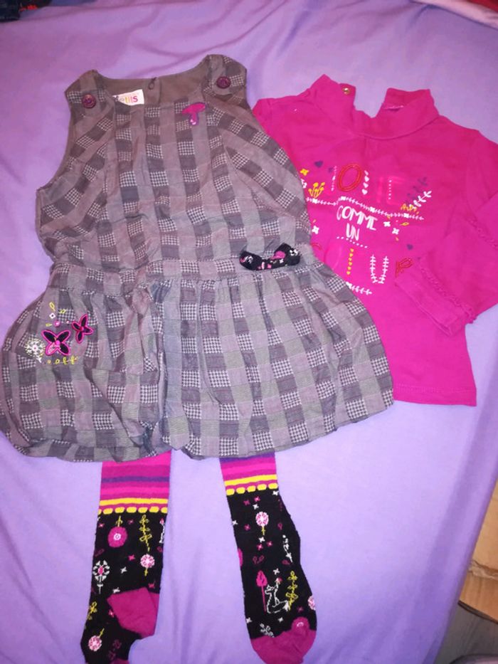 18 mois très bon état pour robe et sous pull, les collants sont un peu boulochés voir photo Lot Robe + collants 21/22 + sous pull
