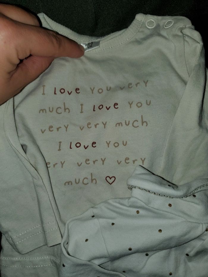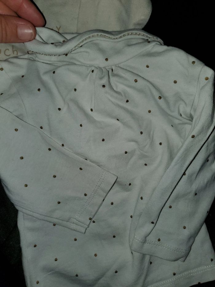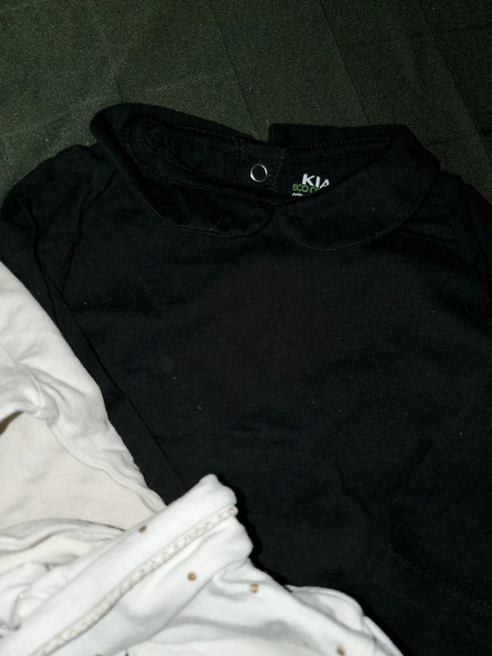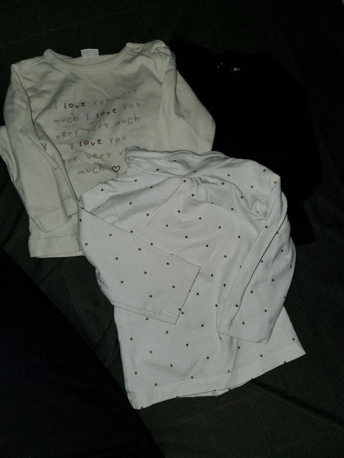 Lot de 3 tee shirt manches longues taille 3 mois. 1 quasi neuf kiabi noir avec col 1 kiabi blanc et paillette doré 1 zeemann blanc avec inscription