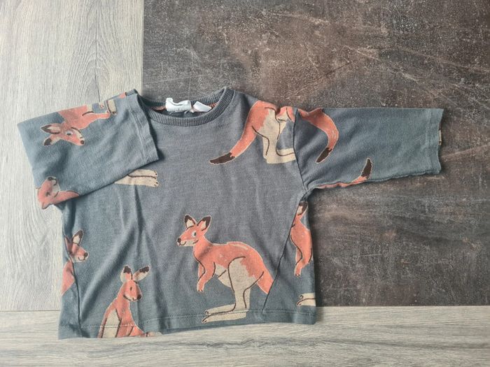 Tee-shirt manches longues gris anthracite avec dessin de kangourou en taille 9-12 mois (80cm) de chez Zara. Correspond à un 12mois car court au niveau longueur