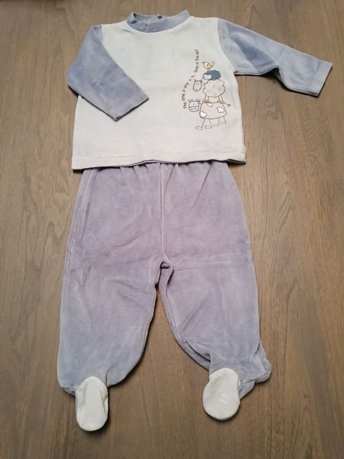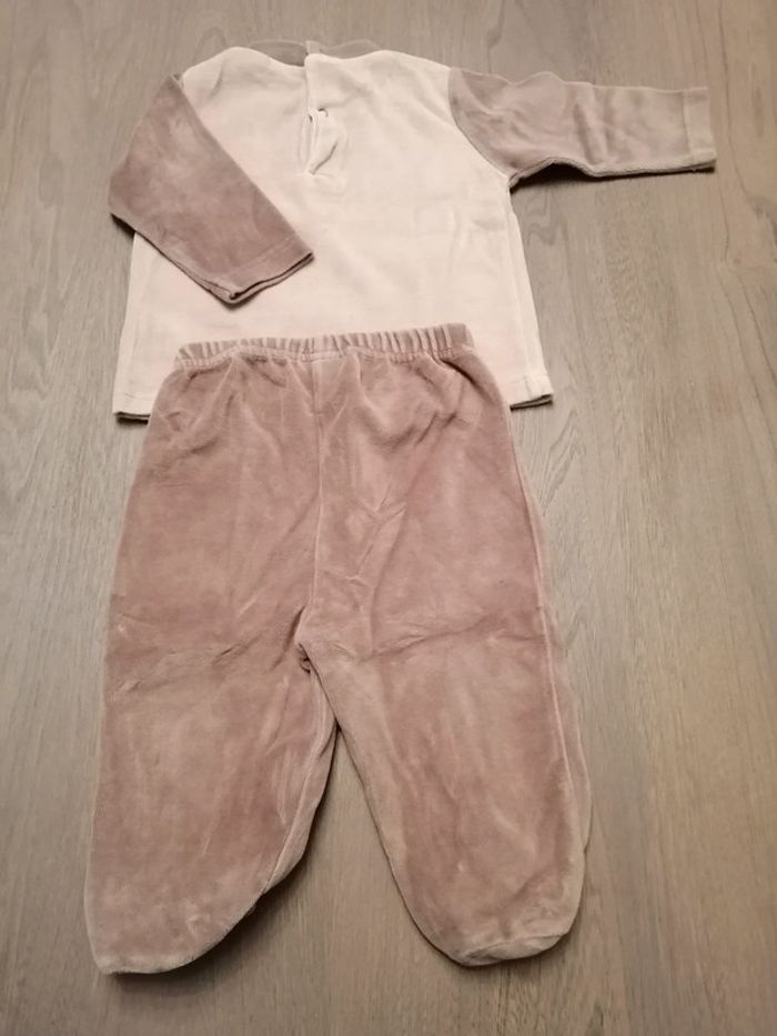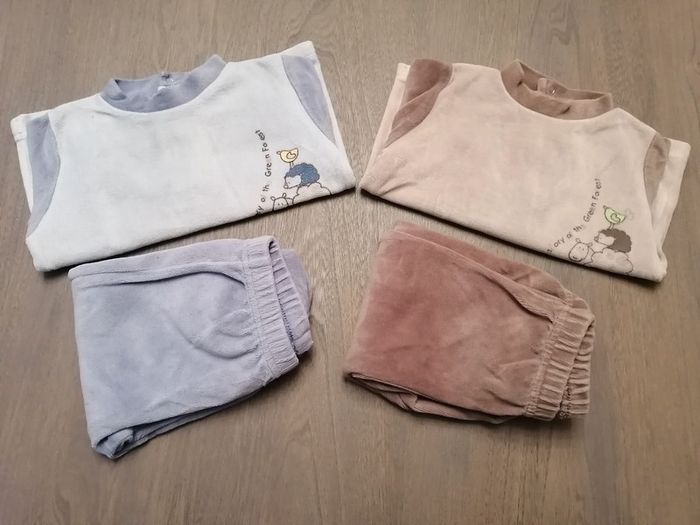 Vends un lot de 2 pyjamas velours 2 pieces, taille 6 mois : - 1 bleu clair/bleu foncé - 1 marron/beige