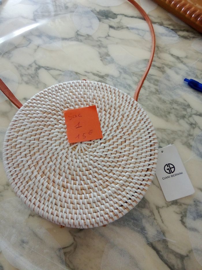 Sac à main rond marque Gianni Bernini état neuf prix sur la photo et un autre petit sac Bon état prix sur la photo me donner le numéro merci