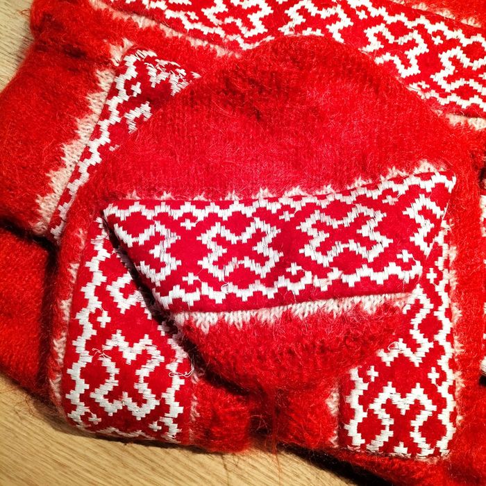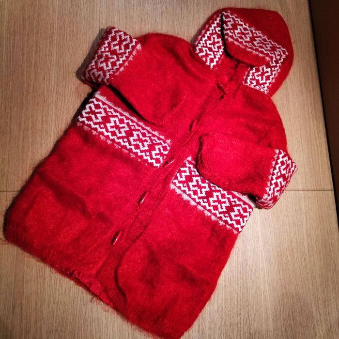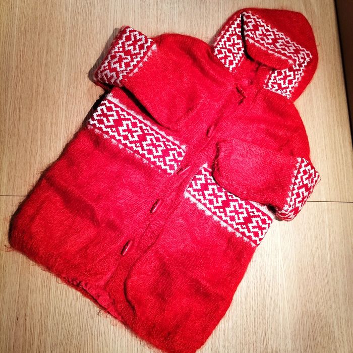 Grand gilet chaud, rouge et blanc, entièrement doublé satin, à boutons, peut servir de manteau au printemps, à capuche, entièrement fait main. Très bon état