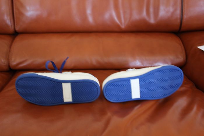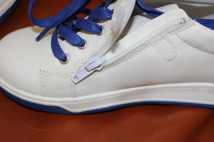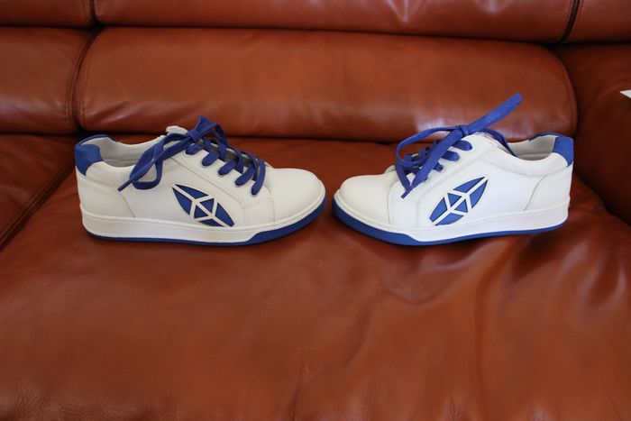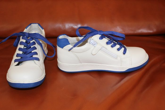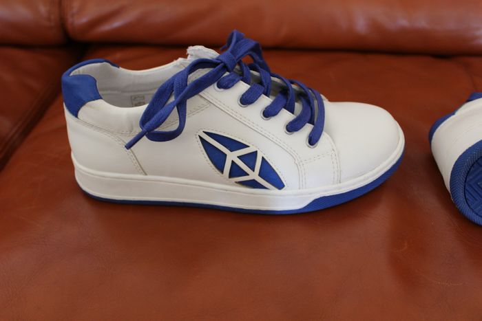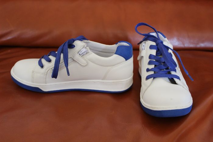 Baskets unisexe En cuir Très bon état Marque Mood Pointure 34 Blanc et bleu Fermeture par zip sur la face interne de la chaussure et/ou lacet