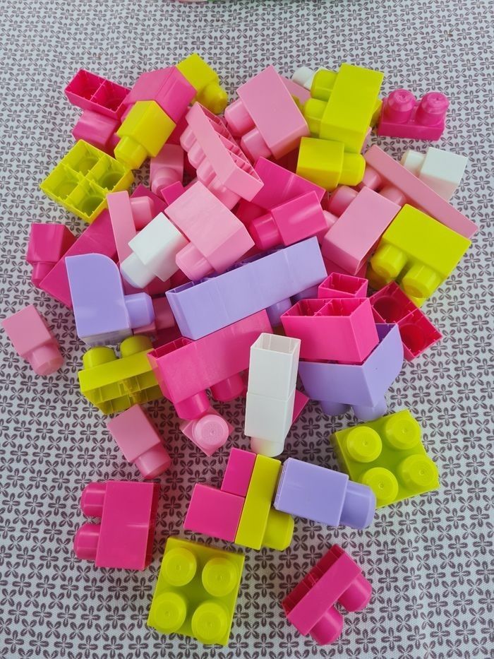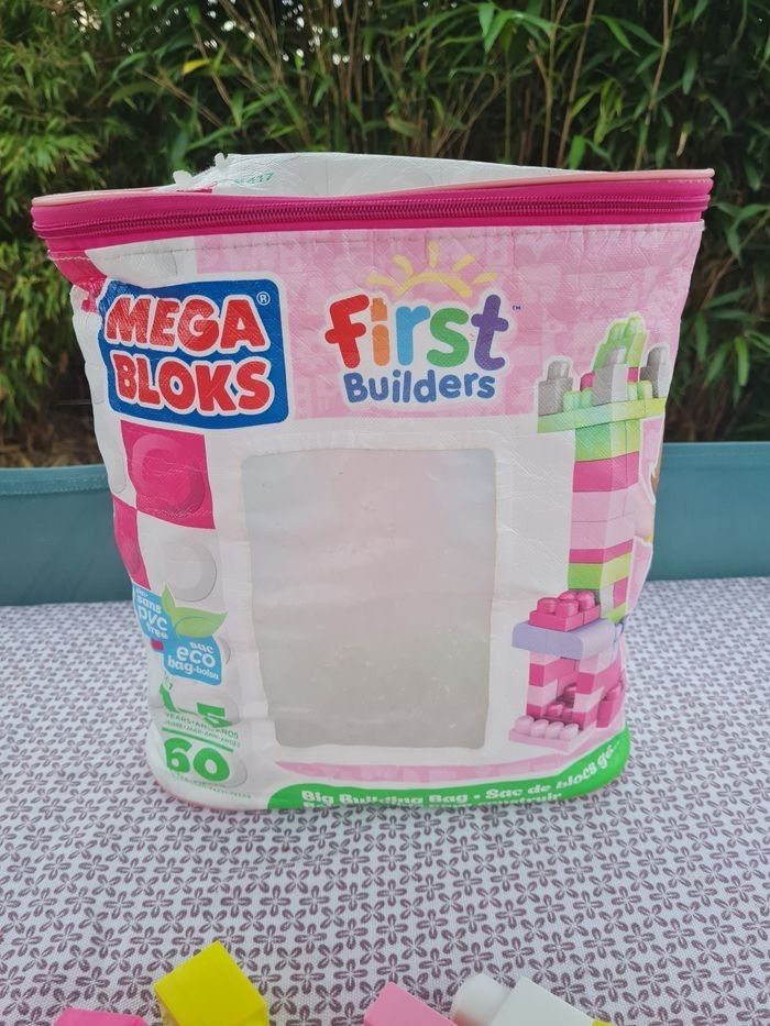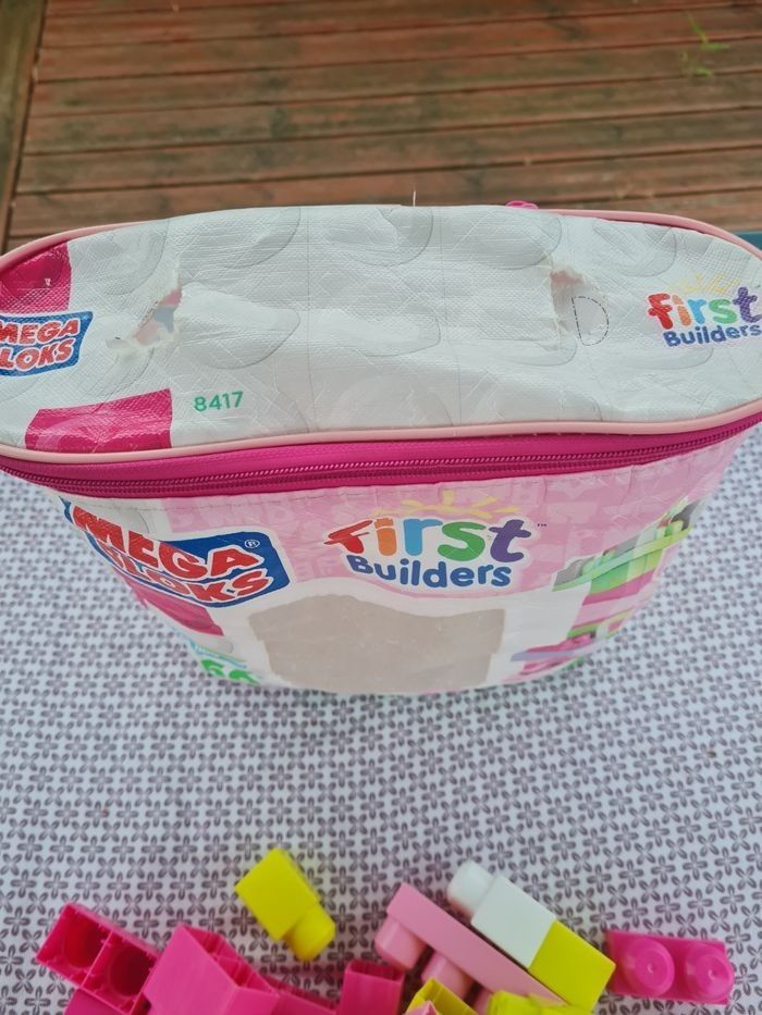 Sac un peu défraîchi mais qui ferme et legos en très bon état général. Il y a 64 blocs géants pour des enfants de 1 à 5 ans. Pour leurs premières constructions.