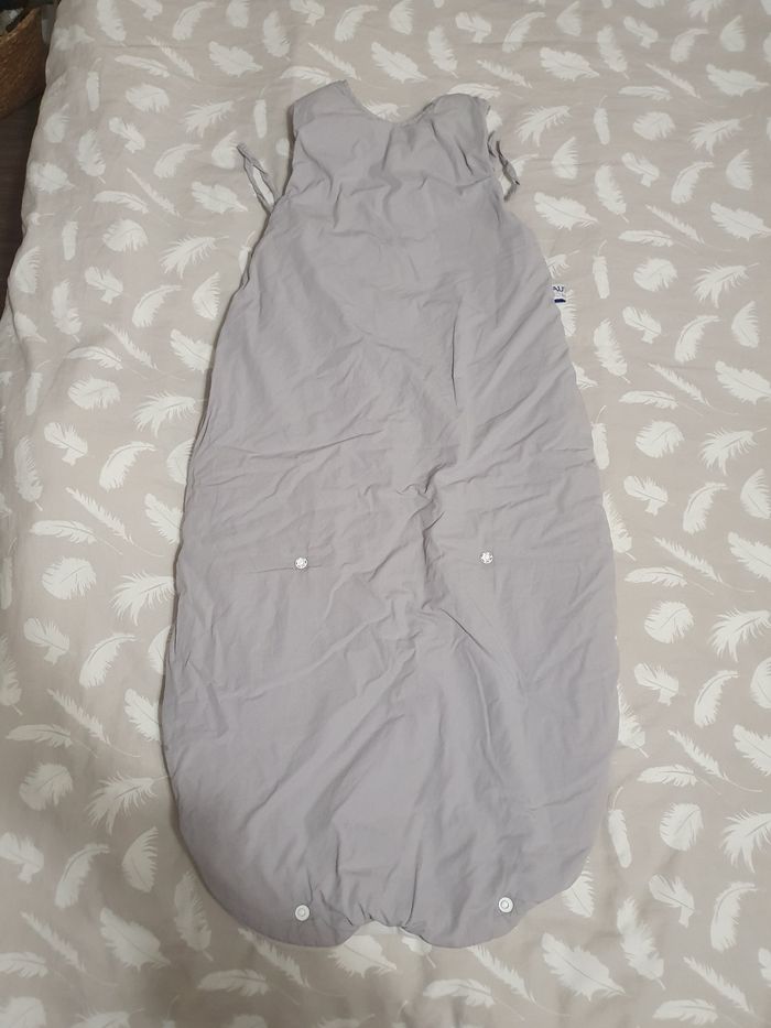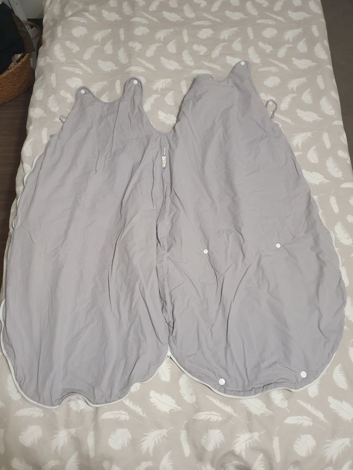 A servi pour mes 2 enfants. Mais reste en bon état. Pas de tâches ni trous. On peu replier le bas pour les nourissons. Taille 6/18mois. Grise et blanche.