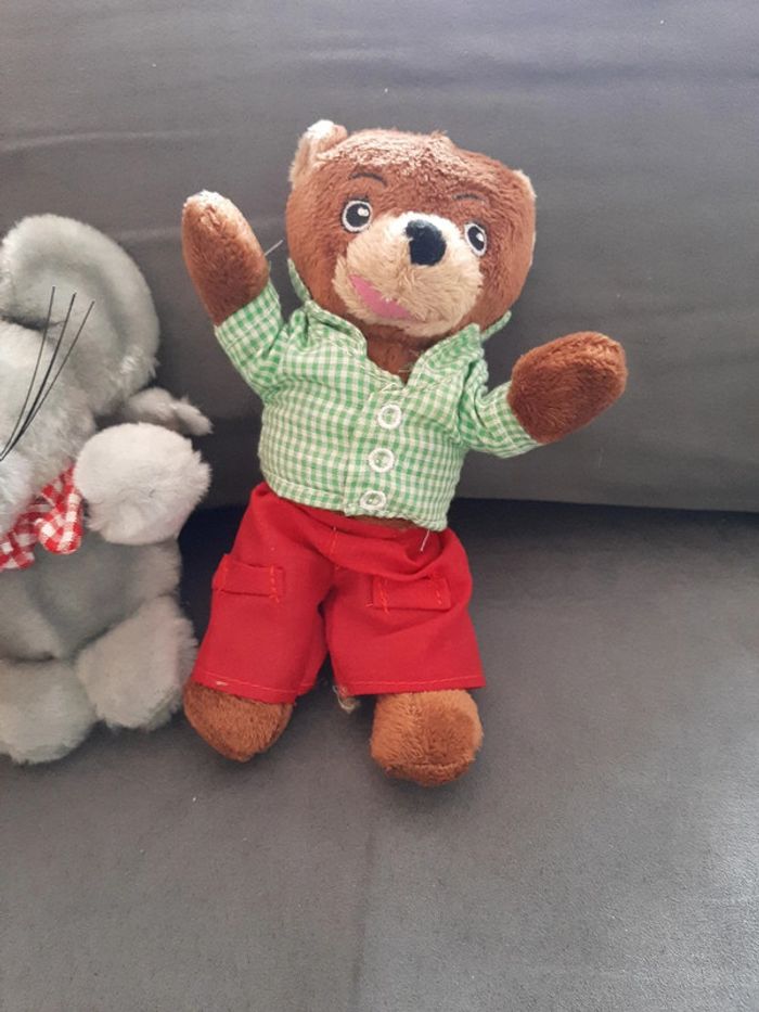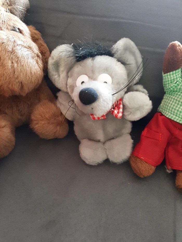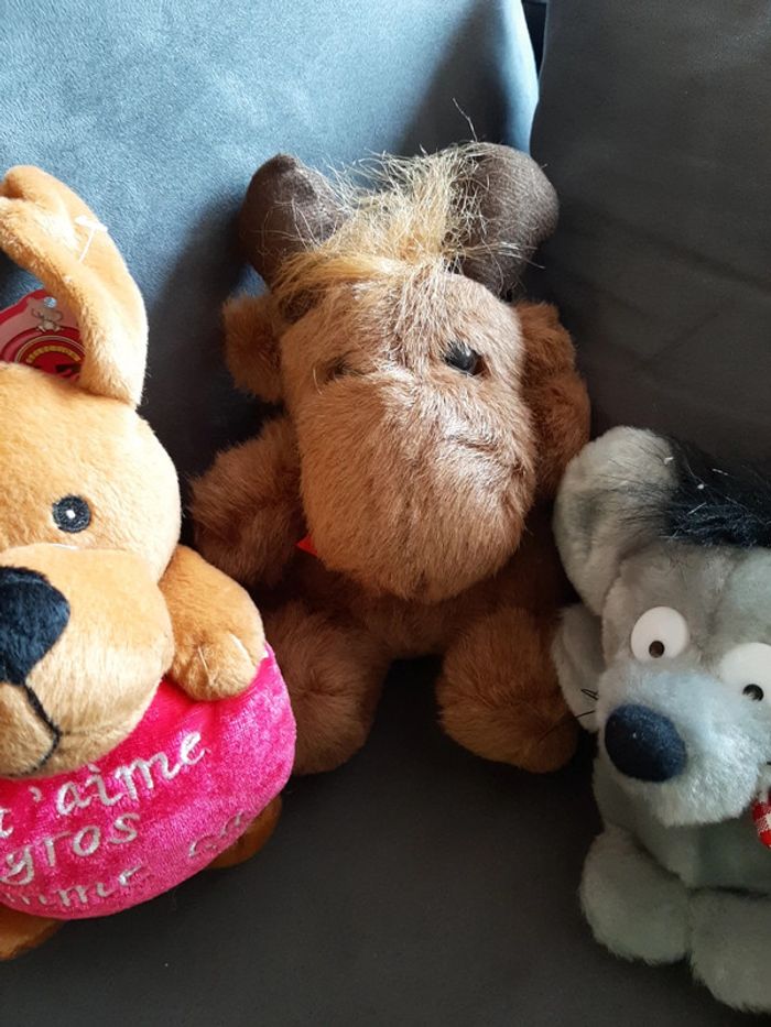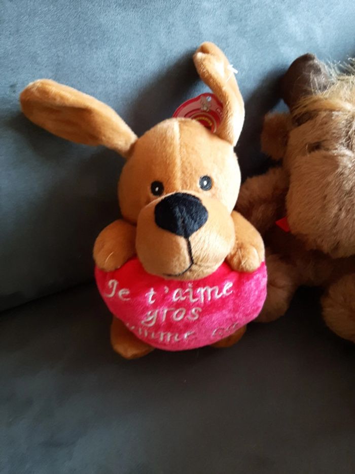 #pitchoune711JEUX Lot de 4 peluches 1 élan 1 chien qui tient un cœur avec Inscription "JE T'AIME GROS COMME ÇA " 1 souris 1 ours État impeccable