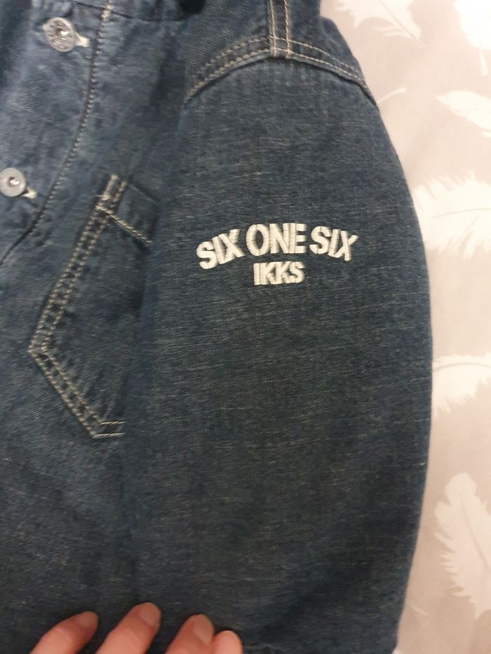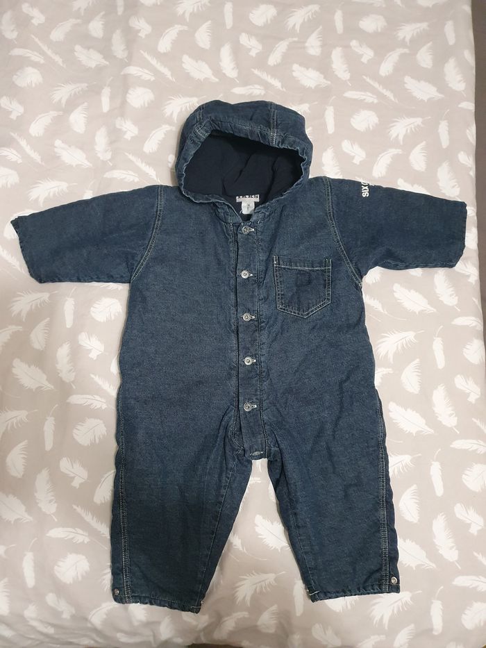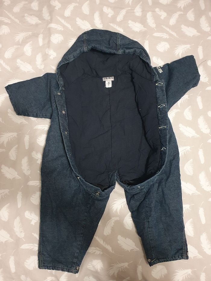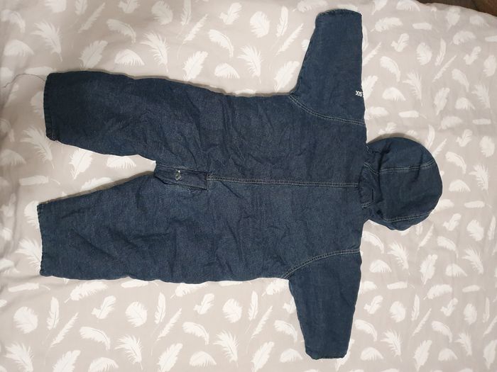 Vraiment confortable et pratique. Elle est très souple pour laisser libre mouvement à bébé. Elle est en jeans et l'interieur est en coton . C'est un modèle vintage de la marque IKKS. Des petits chaussons en jeans s attache avec des pressions, ils sont amovible (non visible sur les photos ) Elle est en très bon état ! Il n'y a que l'étiquette de taille qui a subi le temps qui passe...