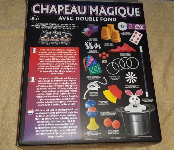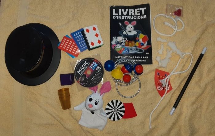 Jeu chapeau magique Avec dvd Manque quelques accessoires : Le mouchoir magique Un pompon Une boule magique Le double fond est décollé, faut juste le recoller Bon etat