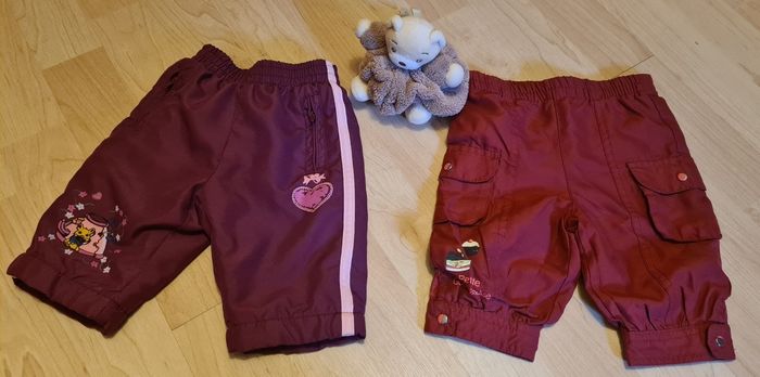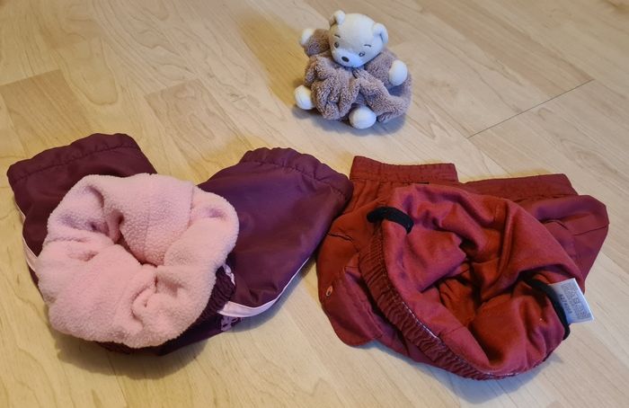 1 pantalon violine doublé rose polaire bien chaud en très bon état 1 pantalon bordeaux doublé tissus petite peinture sur les pressions qui est parti (en grattant ça peut partir et sera uniforme) à vous de voir😁 mais pantalon en très bon état