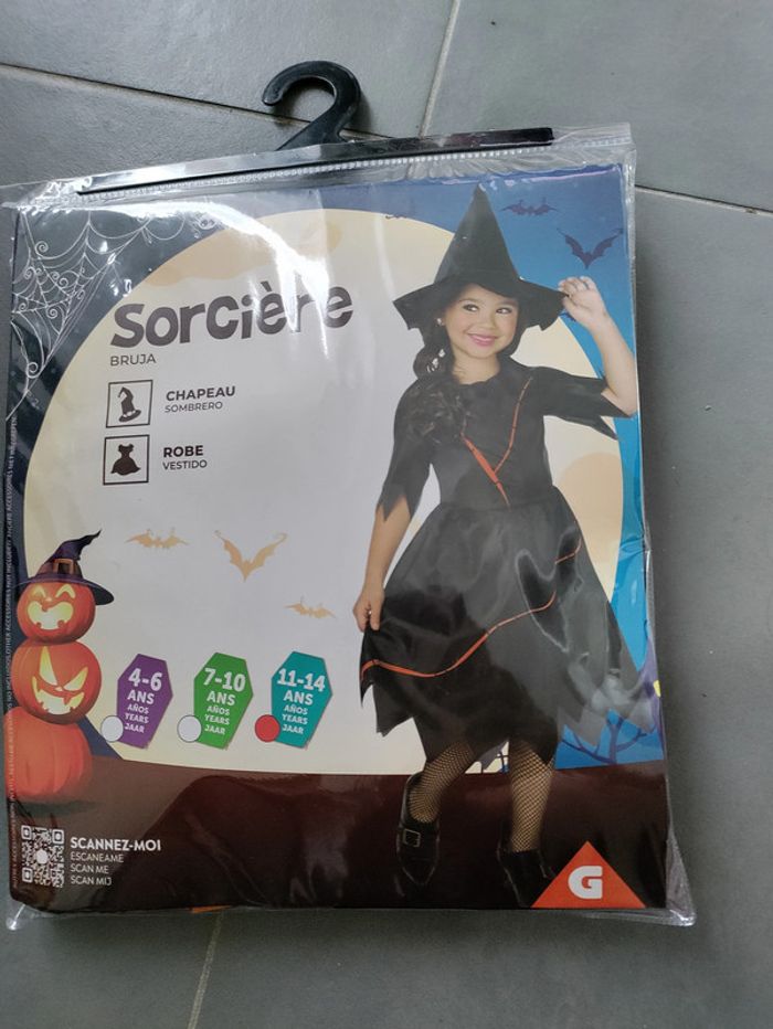 Bonjour, Je vends ce déguisement sorcière 11-14 ans à 5€. Le déguisement est composé d'une robe noire avec des liserets oranges et d'un chapeau noir. À bientôt !