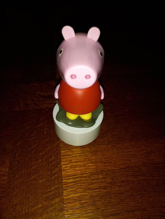 Pepa pig, sur un socle ( bouton ) On appuie dessus, elle parle, malheureusement, elle n'a que deux phrases à son répertoire... donc plus pour la déco. marque Köninkiijke Jumbo année 2003