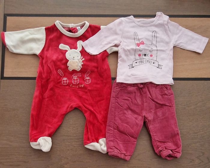 Lot 1 mois en parfait état pyjama velours rouge tee shirt rose lapin pantalon violet doublé