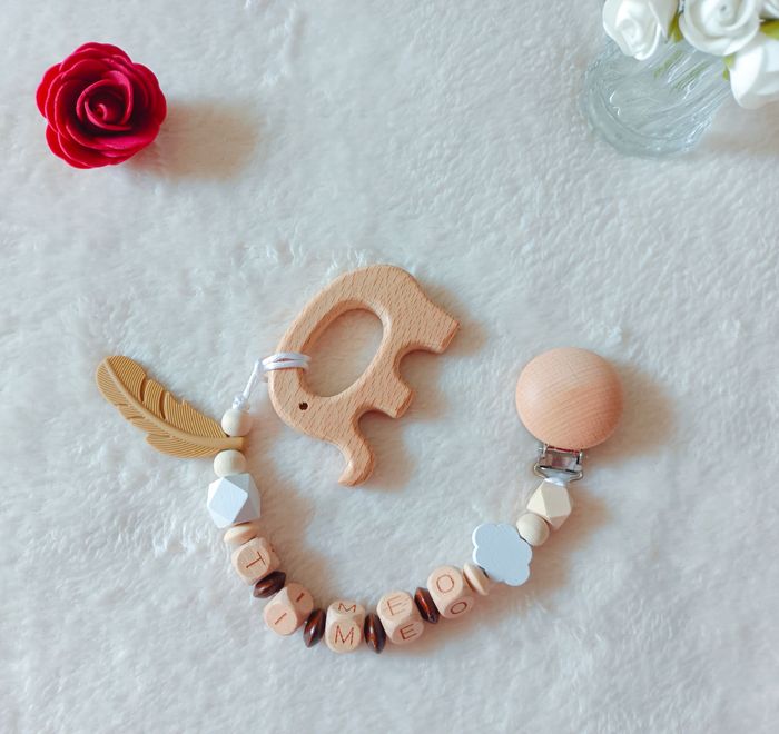 Coffret Attache tétine plume + jouet dentition bois en silicone alimentaire ou/et bois naturel 100% personnalisable. Énormément de choix de composants, vous trouverez forcement votre bonheur et si je n'ai pas, je peux le commander. N'hésitez pas à m'envoyer un message pour que l'on crée ensemble votre accessoire idéal.