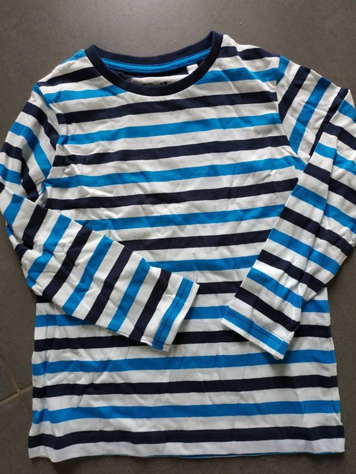 T-shirt rayé, coton assez épais, taille 110. Jamais porté.