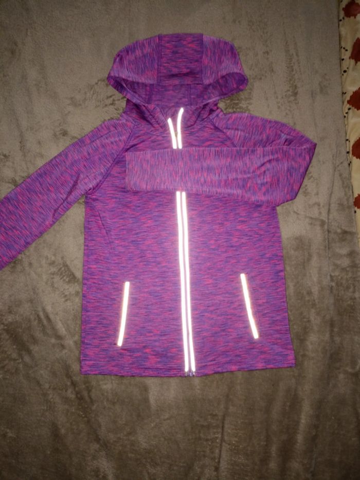 Veste taille 8/9 ans et débardeur taille 7/8 ans. En parfait état rose et violet chiné. Capuche et poches achetées a Primark.