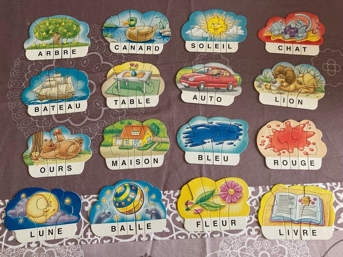 Premiers mots J’apprends l’alphabet en composant des mots Pour 1 à5 enfants de 4à8 ans (voire notice) 16 puzzles mots composés de 78 pièces lettres Les pièces sont en très bon état, la boîte présente des traces d’usure et du scotch
