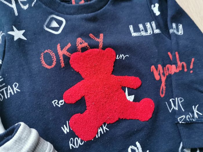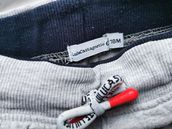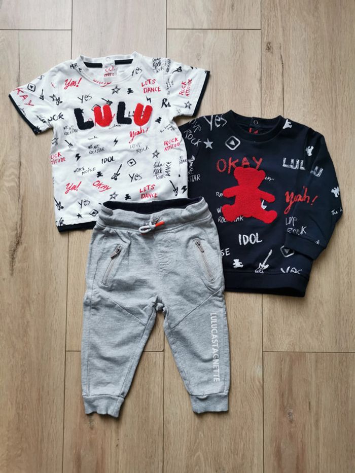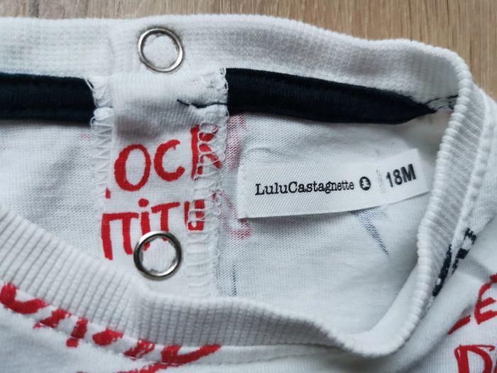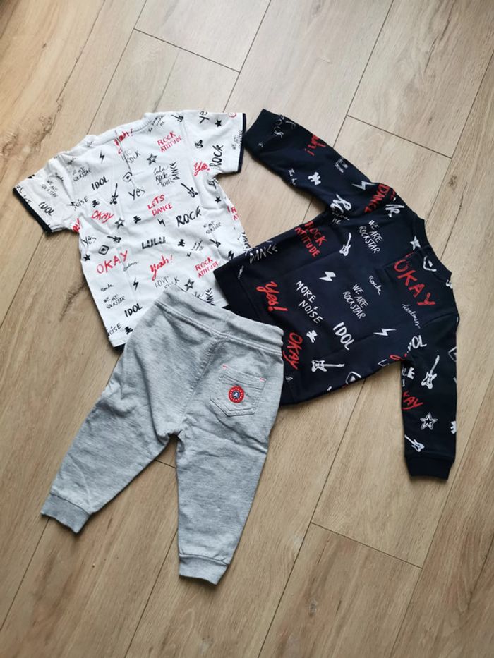 #delph1n3_bebe_18mois Ensemble thème rock de marque Lulu Castagnette taille 18 mois composé de : - 1 t-shirt blanc avec motifs rouges et noir - 1 sweat shirt noir avec motifs rouges et blanc - 1 pantalon sweat gris clair chiné et poinçon rouge sur la poche arrière ceinture réglable par cordon En très bon état. Le pantalon et le sweat ont été portés 2-3 fois. Le t-shirt a juste été lessivé.