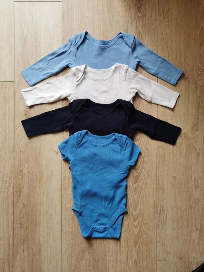 #delph1n3_bebe_9mois Lot de 4 bodies de marque Primark taille 9 mois composé de : - 1 manches longues blanc - 1 manches longues bleu - 1 manches longues bleu marine - 1 manches courtes bleu, petit trou en bas (voir photo)