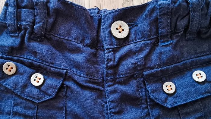 #delph1n3_bebe_6mois Pantalon léger printemps-été taille ajustable en lin bleu marine avec boutons en bois de marque Kitchoun taille 6 mois