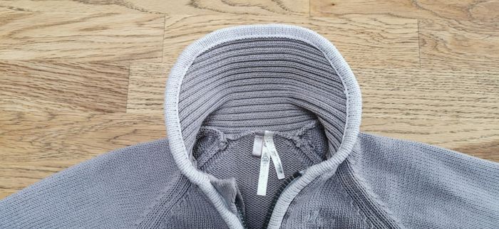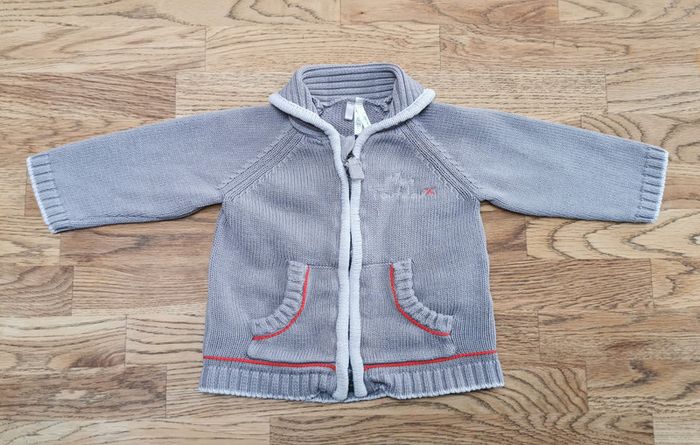 #delph1n3_bebe_3mois Gilet zippé gris à coutures rouges aux poches et ceinture, bordure de zip et col blanc, coudes à rayures grises et blanches de marque Orchestra taille 3 mois