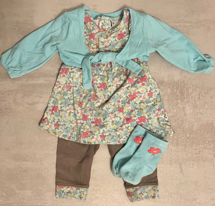 Ensemble composé d’un gilet court, une tunique, un legging et une paire de chaussettes Taille 6 mois Traces d’utilisation et présence de tâches sous les chaussettes Occasion, bon état