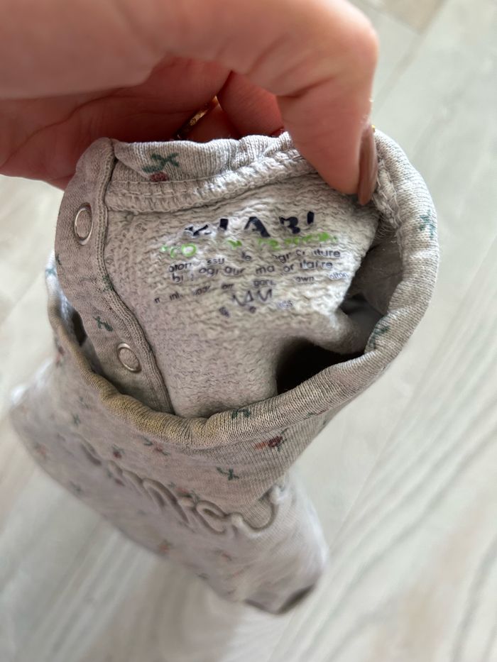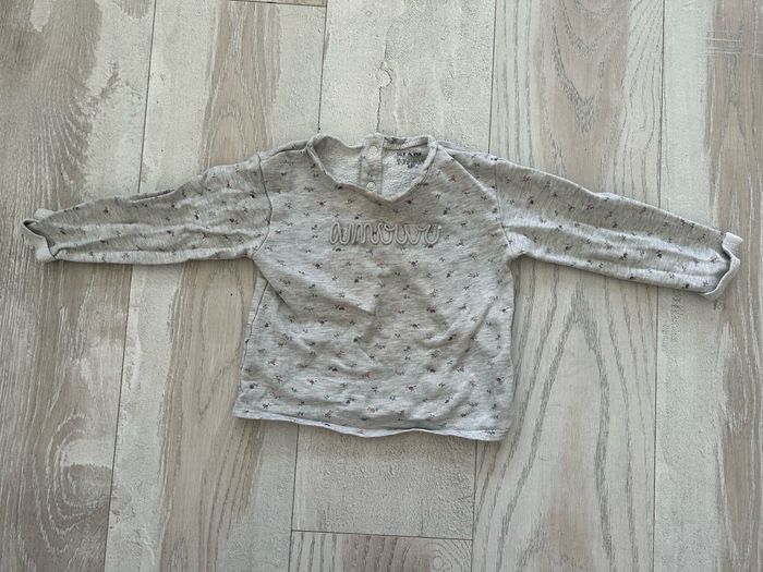 Pull taille 24 mois de la marque Kiabi. Écriture un peu effacé sur l’étiquette. Et une tâche jaune au niveau du coup.