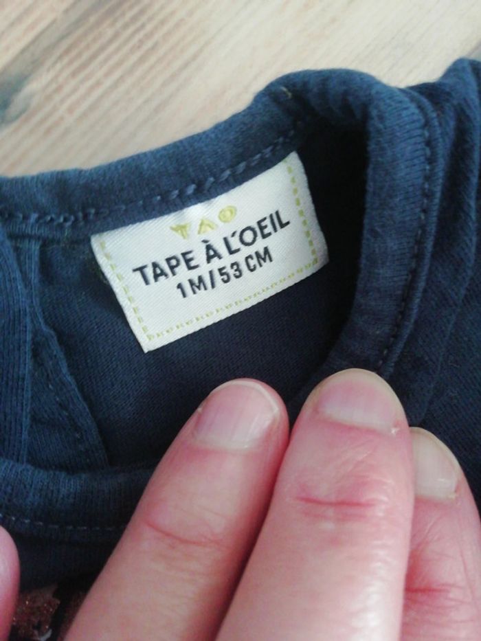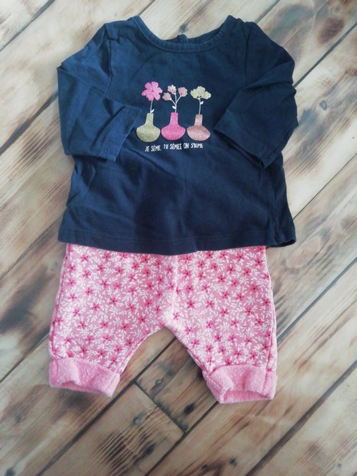 Ensemble 2 pièces qui comprend 1 tee-shirt à manche longue (bleu marine) et sont petit pantalon (rose à fleurs) taille 1 mois (53cm).